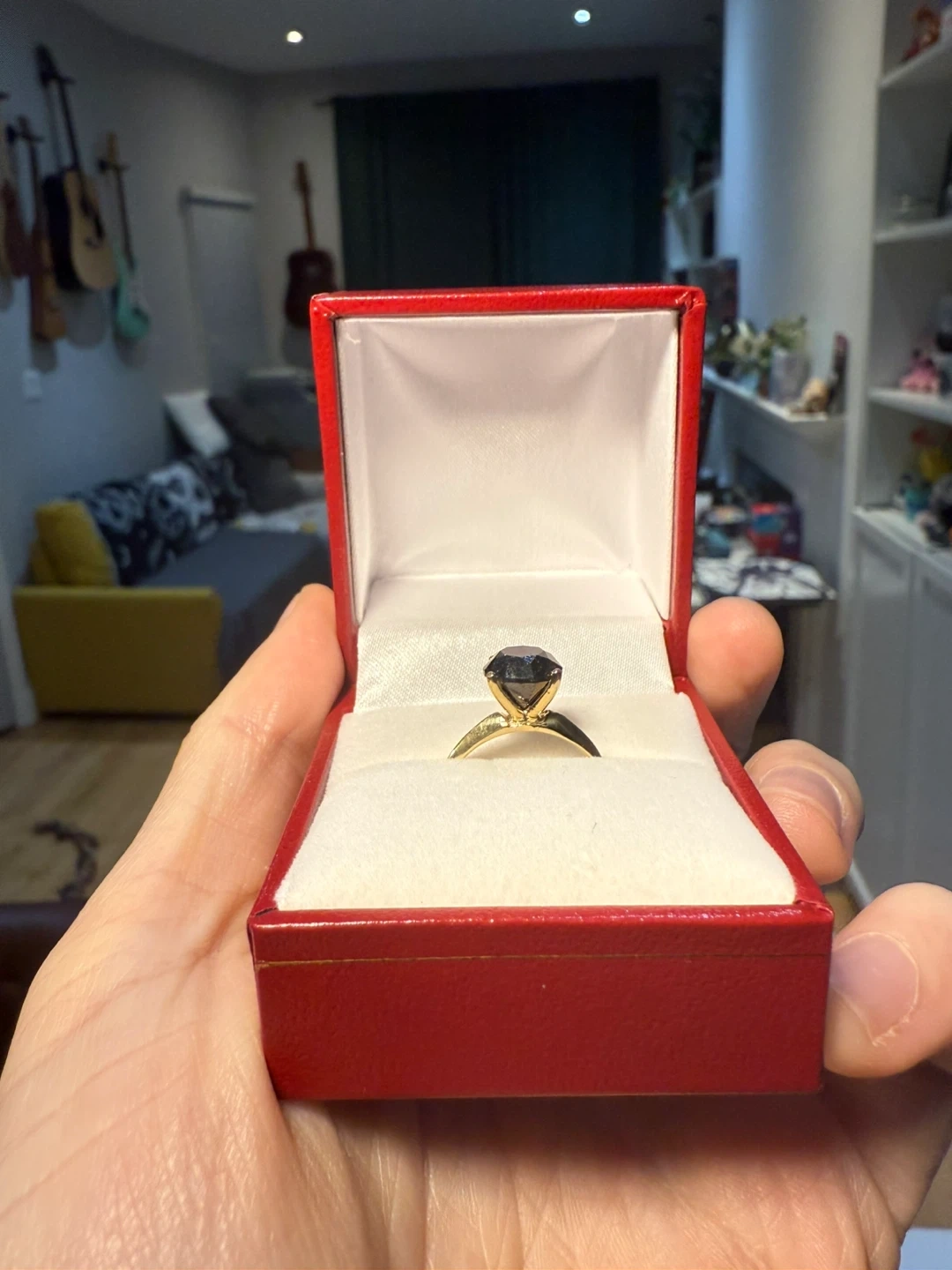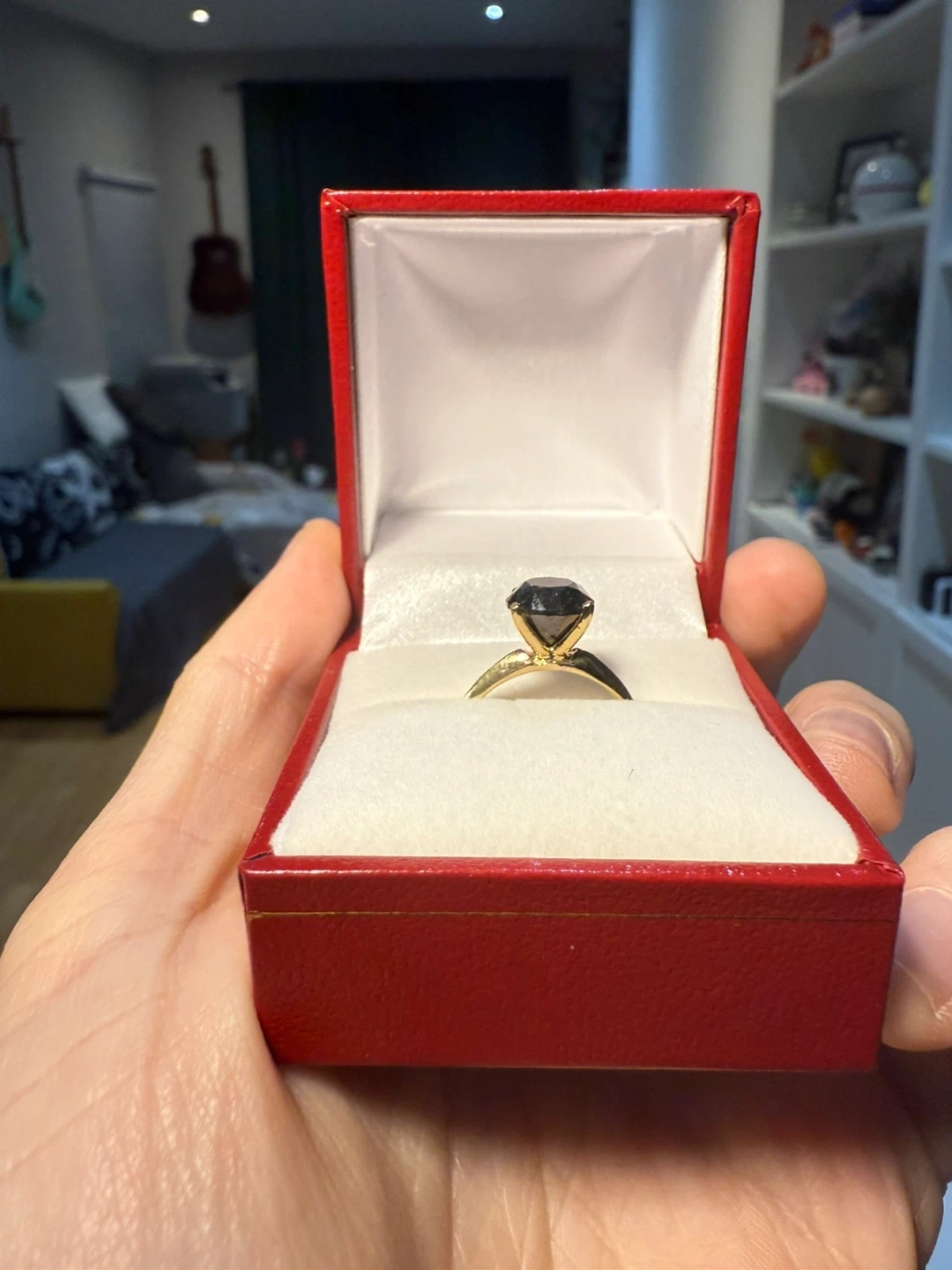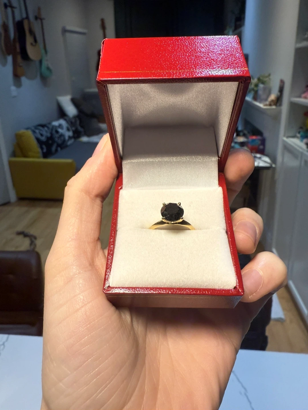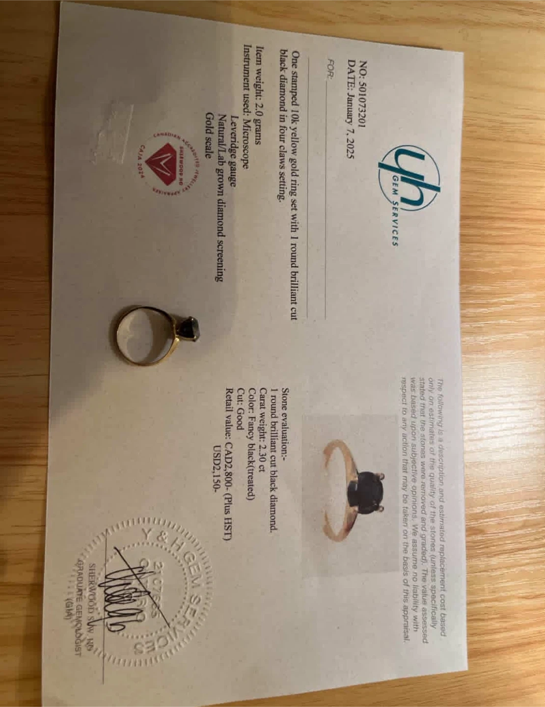 Selling a beautiful yellow gold ring, set with a round brilliant cut black diamond in a four-claws setting. The stone is 2.30 carats. Comes with the original box. According to the appraisal, the retail value is USD$2,150