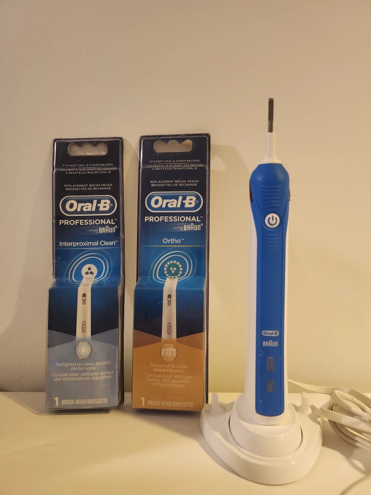 Selling an Oral-B Professional electric toothbrush in great condition! It comes with the charging base and two replacement brush heads: one Interproximal Clean and one Ortho brush head