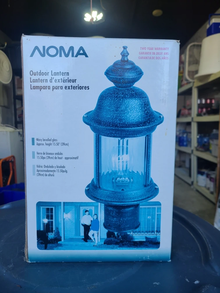 Here's a NOMA outdoor lantern with a green verde finish. It features wavy bevelled glass and is approximately 15.50" (39cm) in height. Easy installation instructions are included, and it comes with a two-year warranty. Included are pliers and a screwdriver set, along with 3 wire connectors. The box is included too!