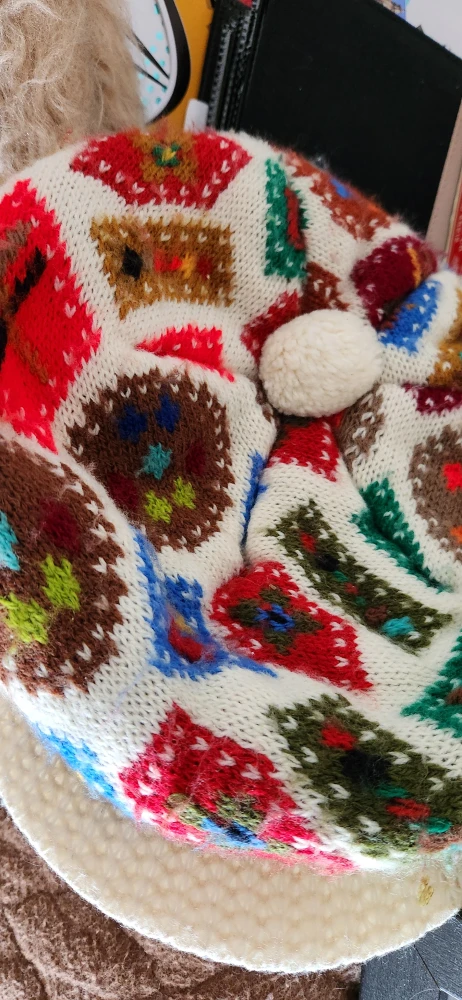 Cozy knit visor beanie, perfect for adding a pop of colour to your winter wardrobe! It features a fun, colourful pattern and a cute pom pom on top. It's in great condition and ready to keep you warm and stylish this season