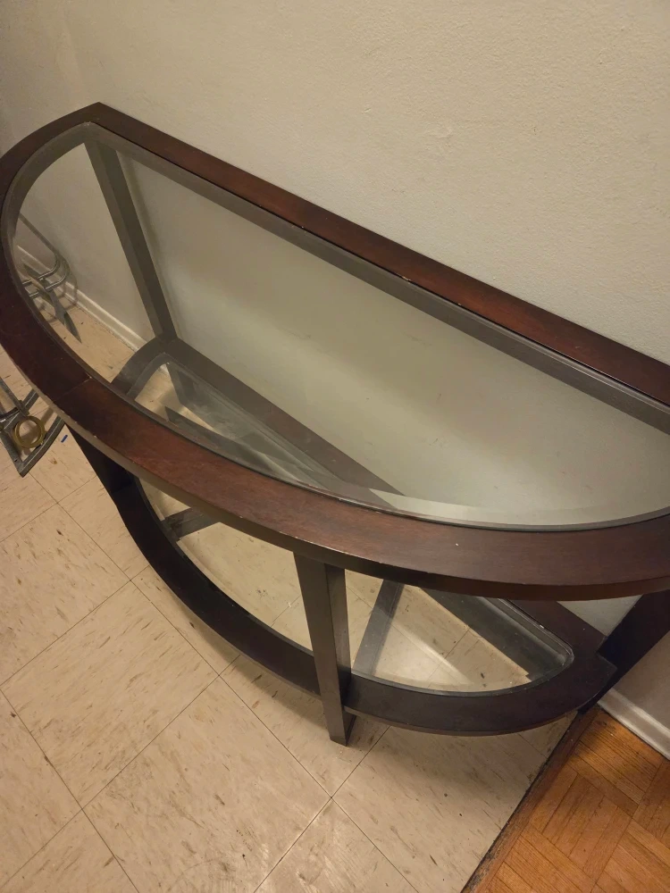 Selling a half-moon shaped console table with a glass top and a dark wood frame. It's in good condition and would look great in an entryway or living room!