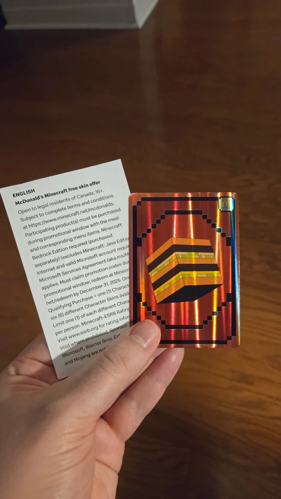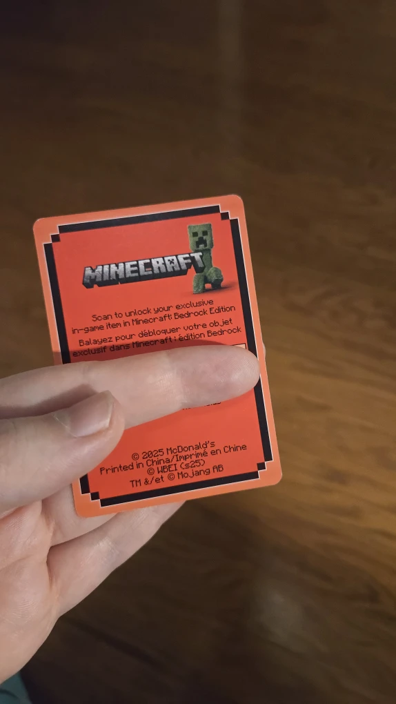 Selling a McDonald's Minecraft Burger Block toy and free skin offer card. Scan to unlock your exclusive in-game item in Minecraft: Bedrock Edition.