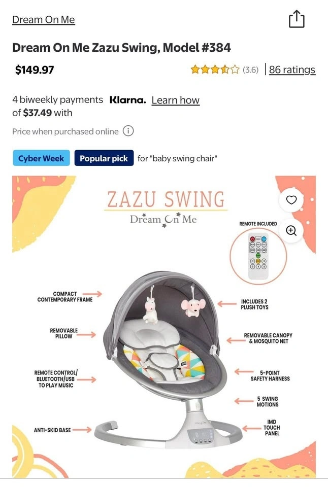 Zazu, a cozy Swing by Dream On Me which is designed and engineered to comfort baby from birth to six months. It's compact contemporary frame and multi lullaby melodies make for a soothing solution at home or on-the-go so you can use a few extra hands-free moments in your day. With 5 speeds to choose from, you can choose the swinging speed that baby prefers most.