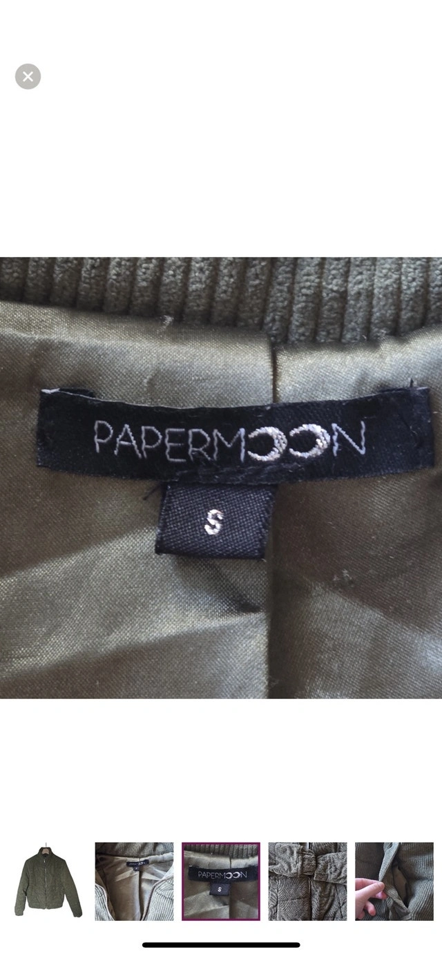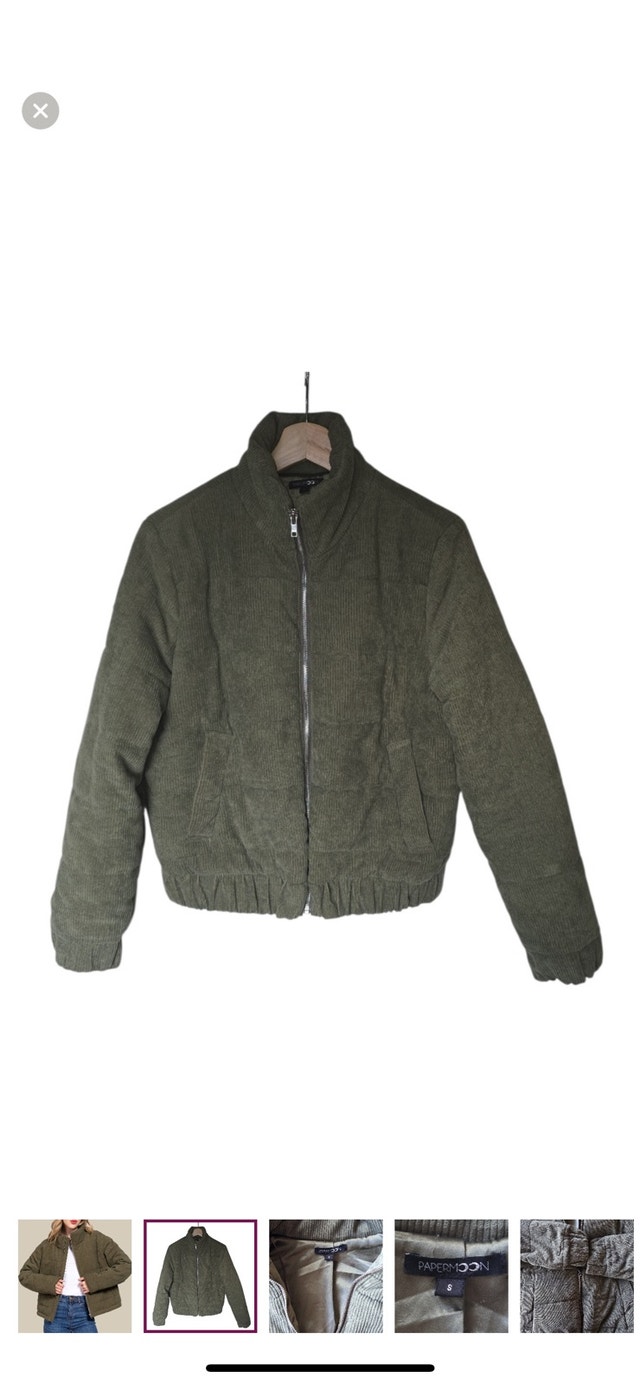 Brand: Paper Moon. Size: Small. Colour: Olive Green. Material: Corduroy. Closure: Zipper. Great puffer jacket perfect for Fall and Spring! So cozy and soft. Relaxed fit small. Excellent preloved condition, no stains or rips. Satin lining in very good condition. 22" ptp 23" long. Smoke free pet free home.
