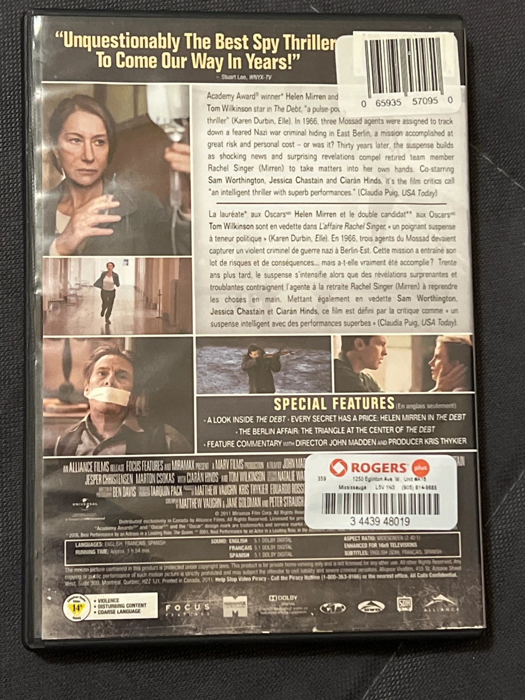 Selling a DVD of the movie 'The Debt'. It's a spy thriller starring Helen Mirren and Tom Wilkinson. The running time is 1 hour and 54 minutes. Enjoy!