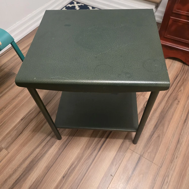 Selling a cute little green side table! It has a shelf underneath for extra storage or decor. It's in good condition and would be perfect for a living room or bedroom