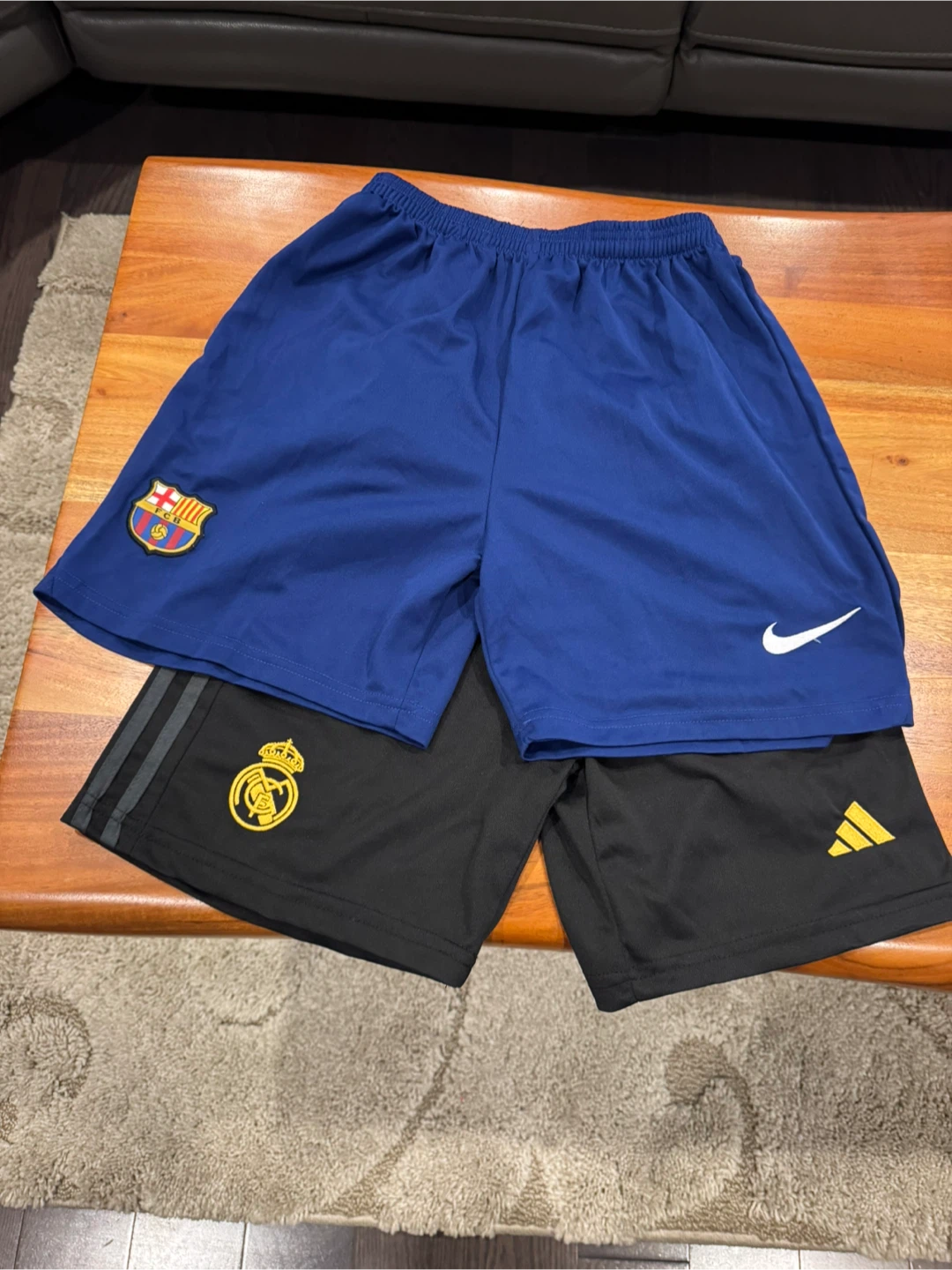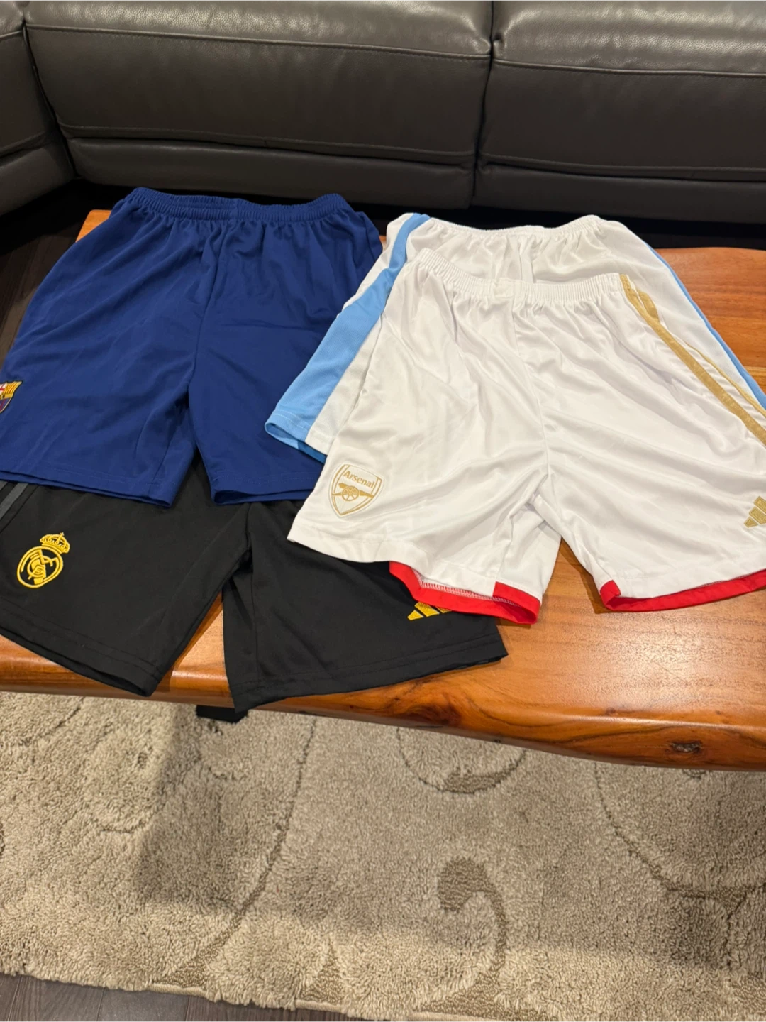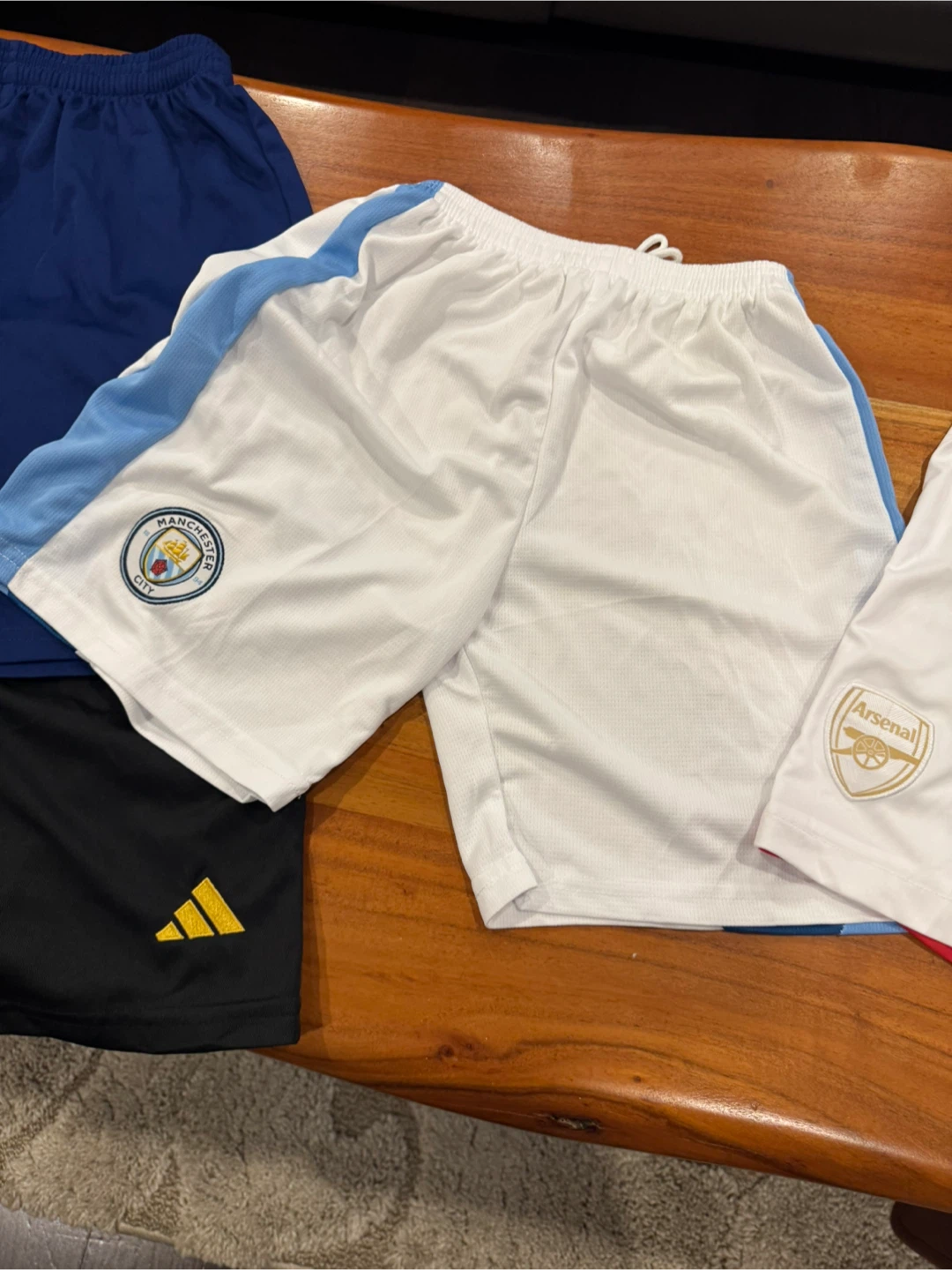 Includes shorts from Adidas (Arsenal, Real Madrid), Nike (Barcelona), and Puma (Manchester City jersey).