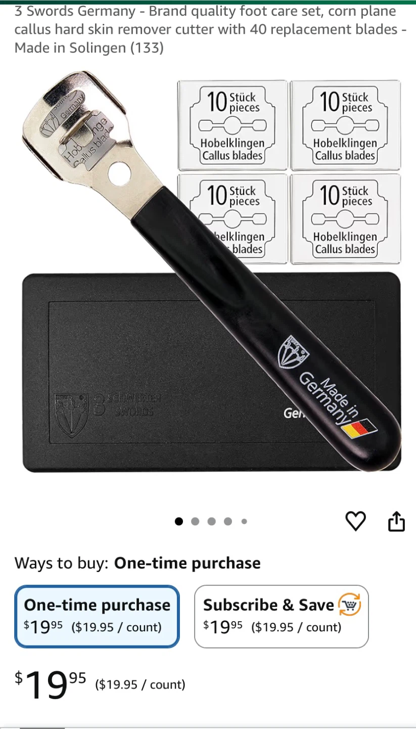 Selling a brand new 3 Swords Germany pedicure set! It's a brand quality foot care set, including a corn plane callus hard skin remover cutter with 40 replacement blades. The set is made in Solingen, Germany. Perfect for removing calluses and dead skin cells after soaking your feet in a foot bath