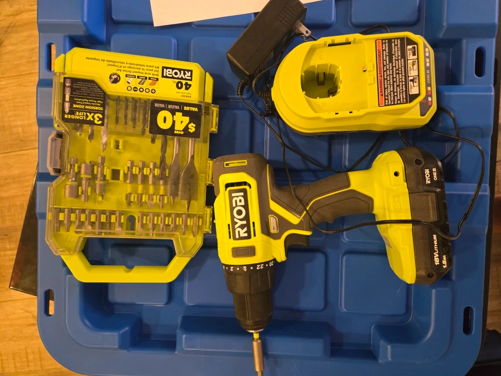 Selling a Ryobi ONE+ drill kit that includes the drill, charger, and a 40-piece drill and impact driver bit set! Great for various projects around the house. The drill uses an 18V lithium battery. The bit set is valued at $40.