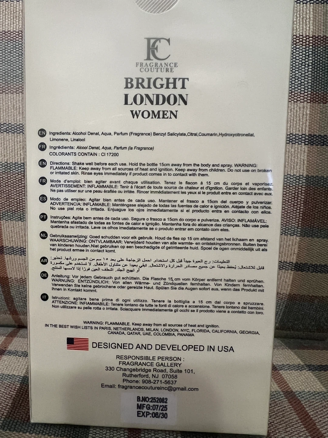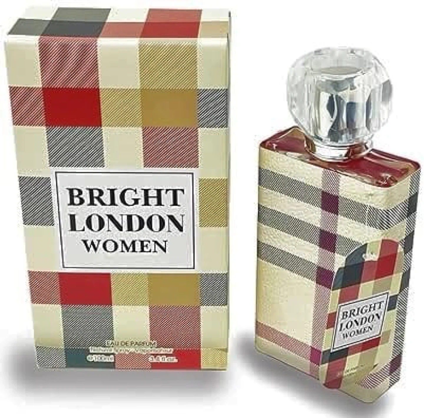 Selling a bottle of Bright London Women Eau de Parfum. It's a natural spray with a volume of 100ml / 3.4 fl.oz. The manufacturing date is July 2025, and the expiry date is August 2030. It's designed and developed in the USA.