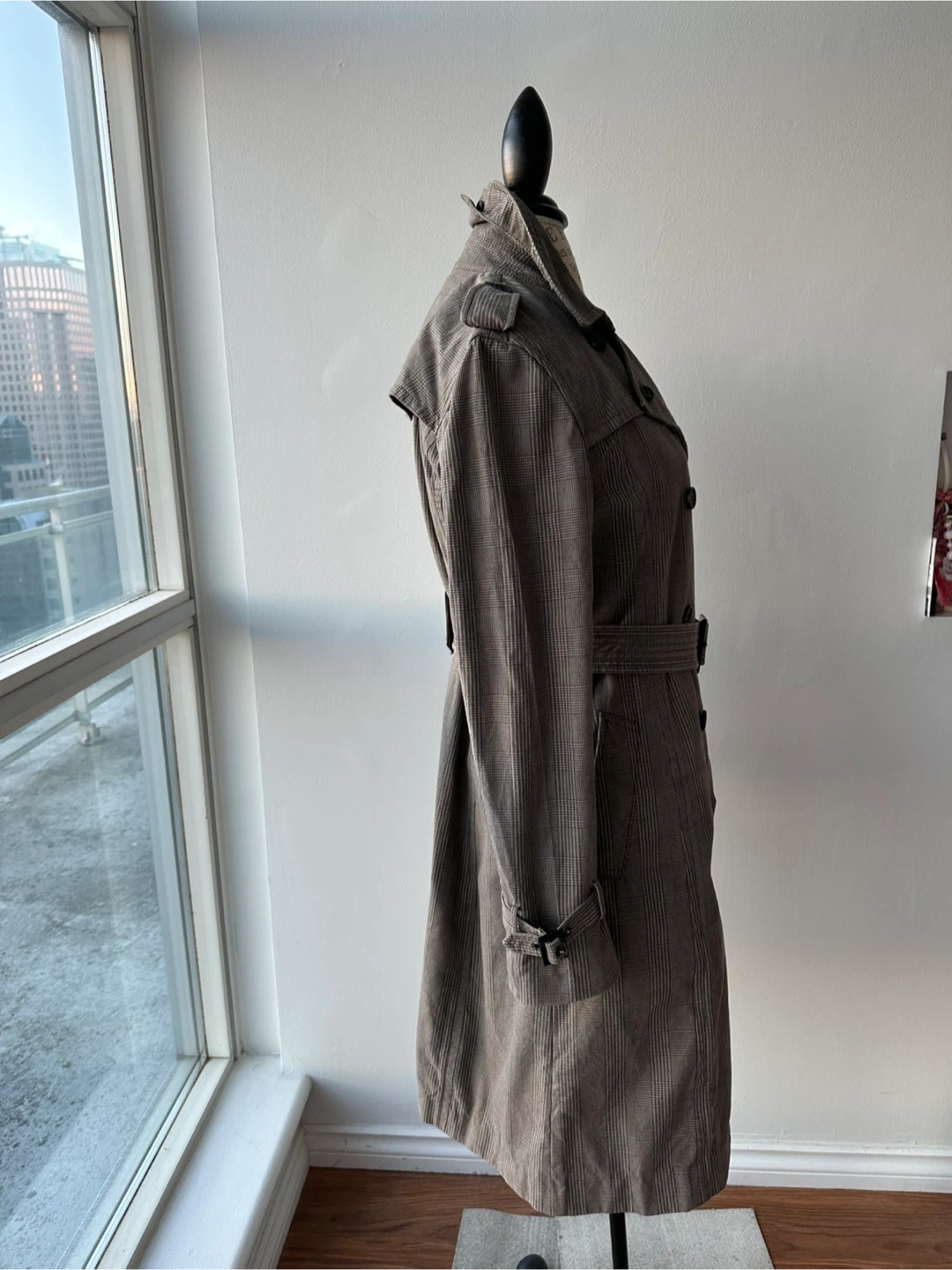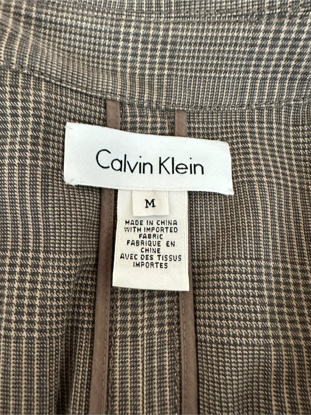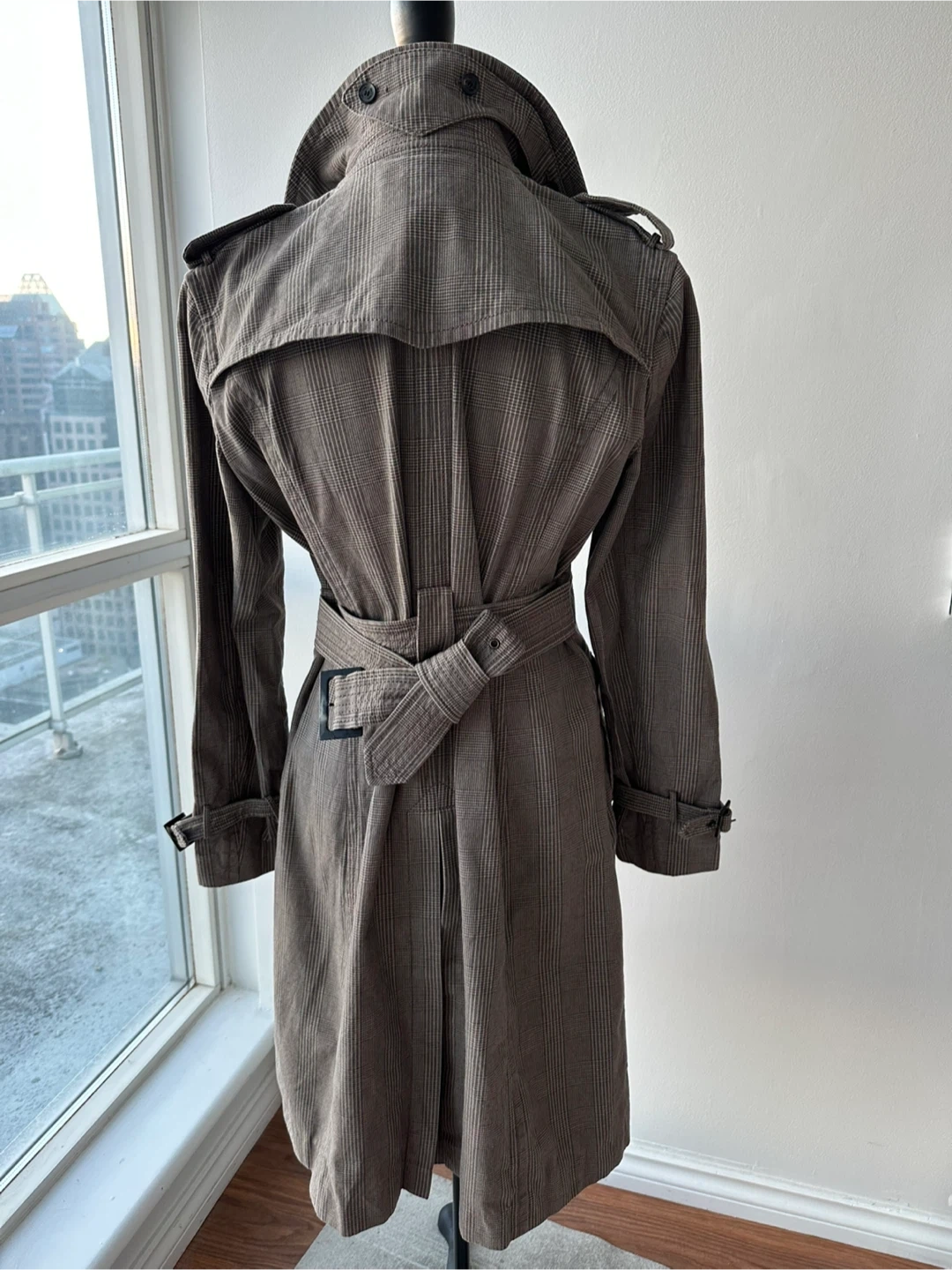 Classic Calvin Klein trench coat with a stylish plaid pattern! It features a double-breasted design and a buttoned back vent in the back. Perfect for adding a touch of sophistication to any outfit and a must have for your wardrobe!