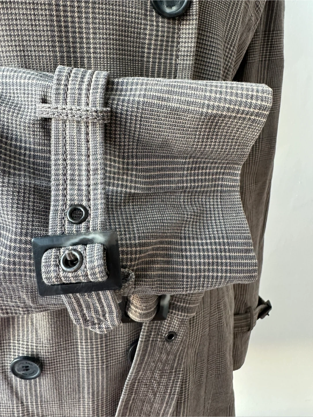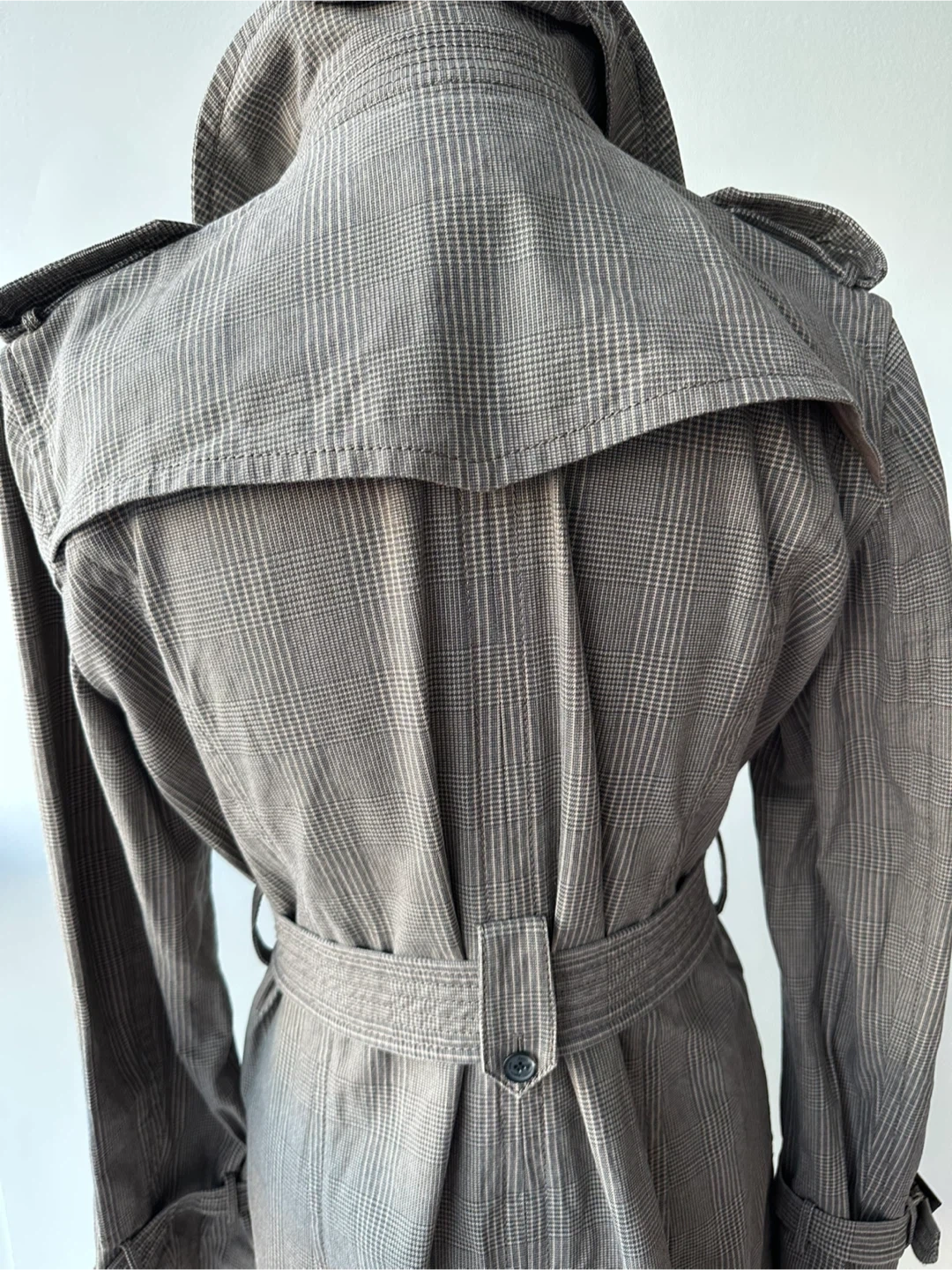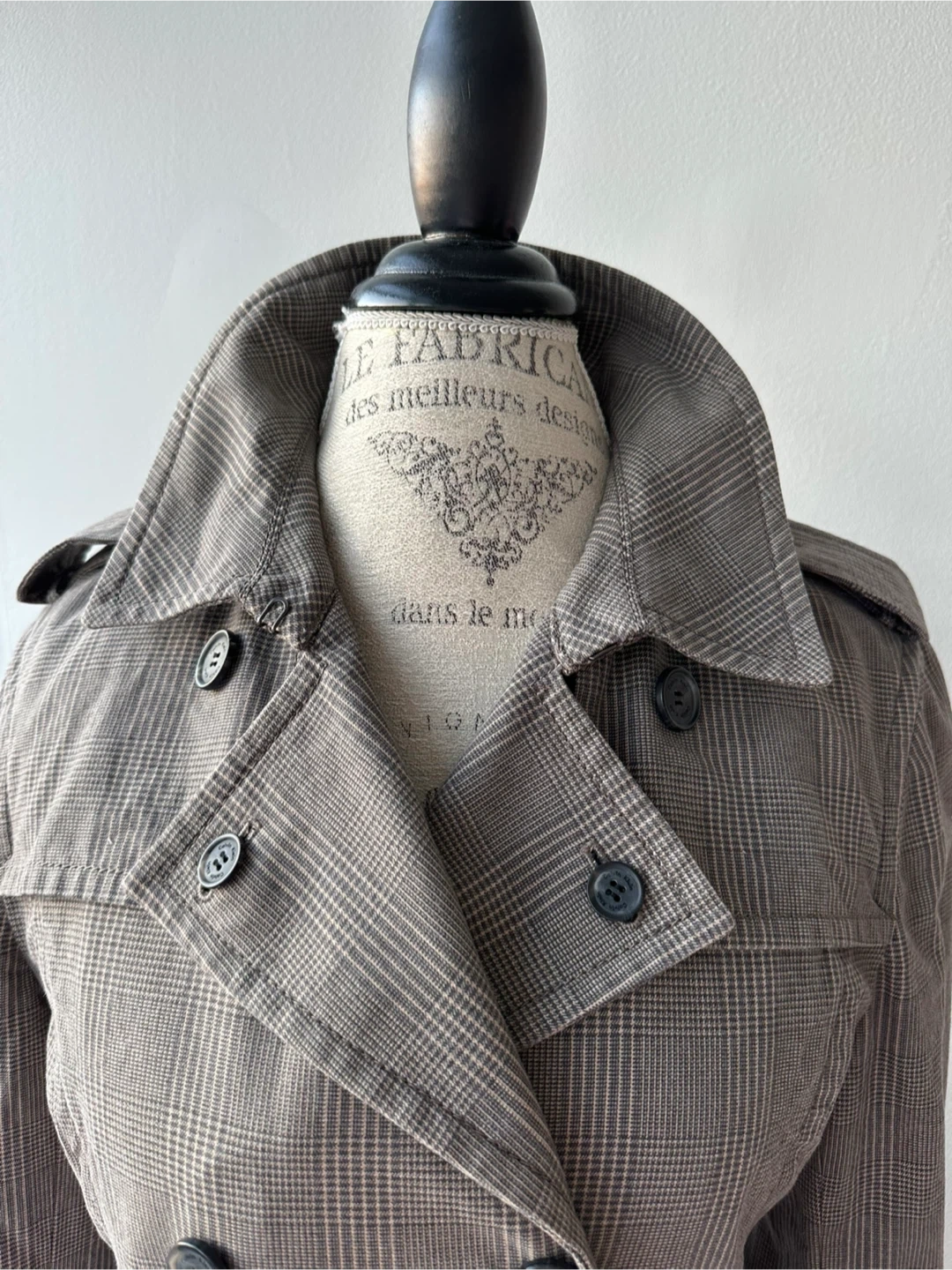Classic Calvin Klein trench coat with a stylish plaid pattern! It features a double-breasted design and a buttoned back vent in the back. Perfect for adding a touch of sophistication to any outfit and a must have for your wardrobe!
