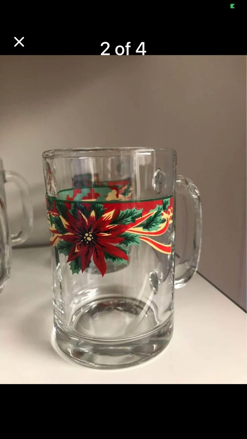 Here are some clear glass mugs with a festive poinsettia and ribbon design, perfect for the holidays! They're in great shape and ready to add some cheer to your kitchen
