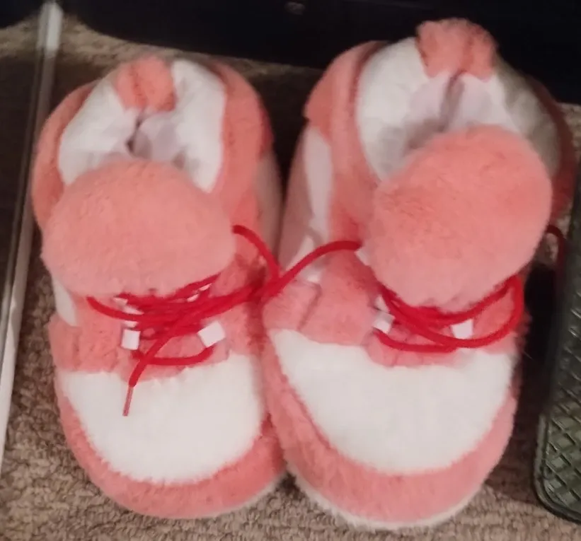 These fuzzy slippers are super cute and cozy! They're pink and white with red laces, making them look like mini sneakers. Perfect for keeping your feet warm on chilly days!