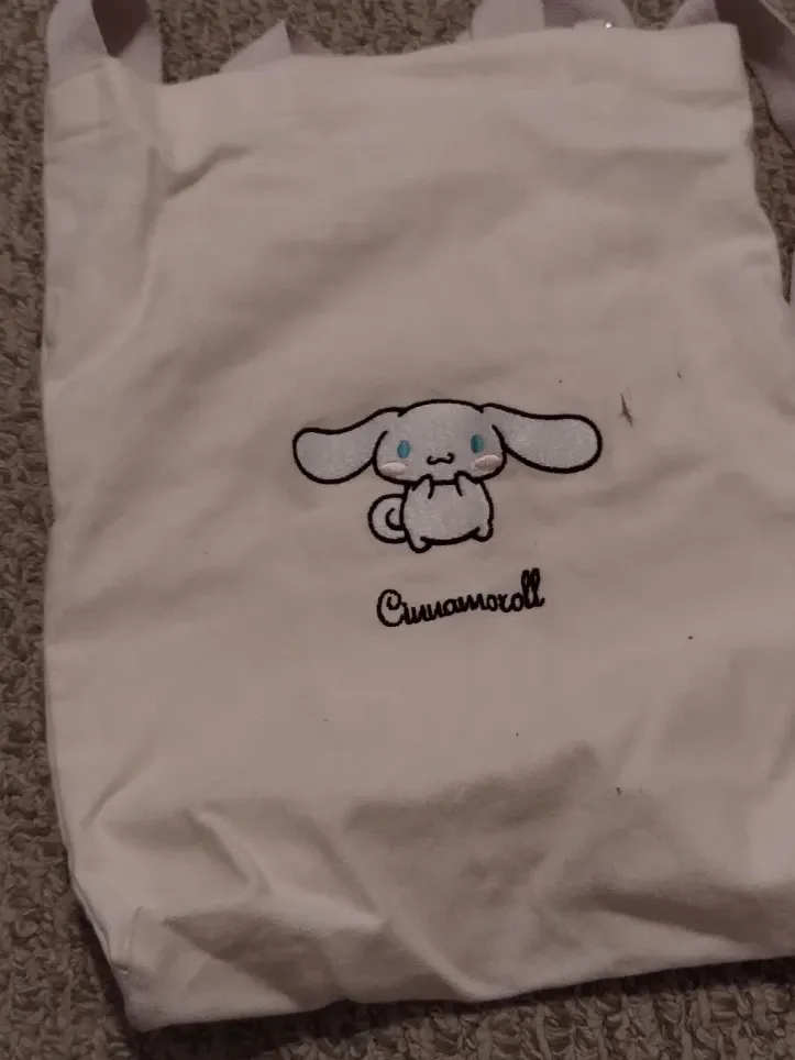 Selling a cute Cinnamoroll tote bag! It's a simple white colour with the Cinnamoroll character embroidered on the front. Perfect for carrying books or groceries
