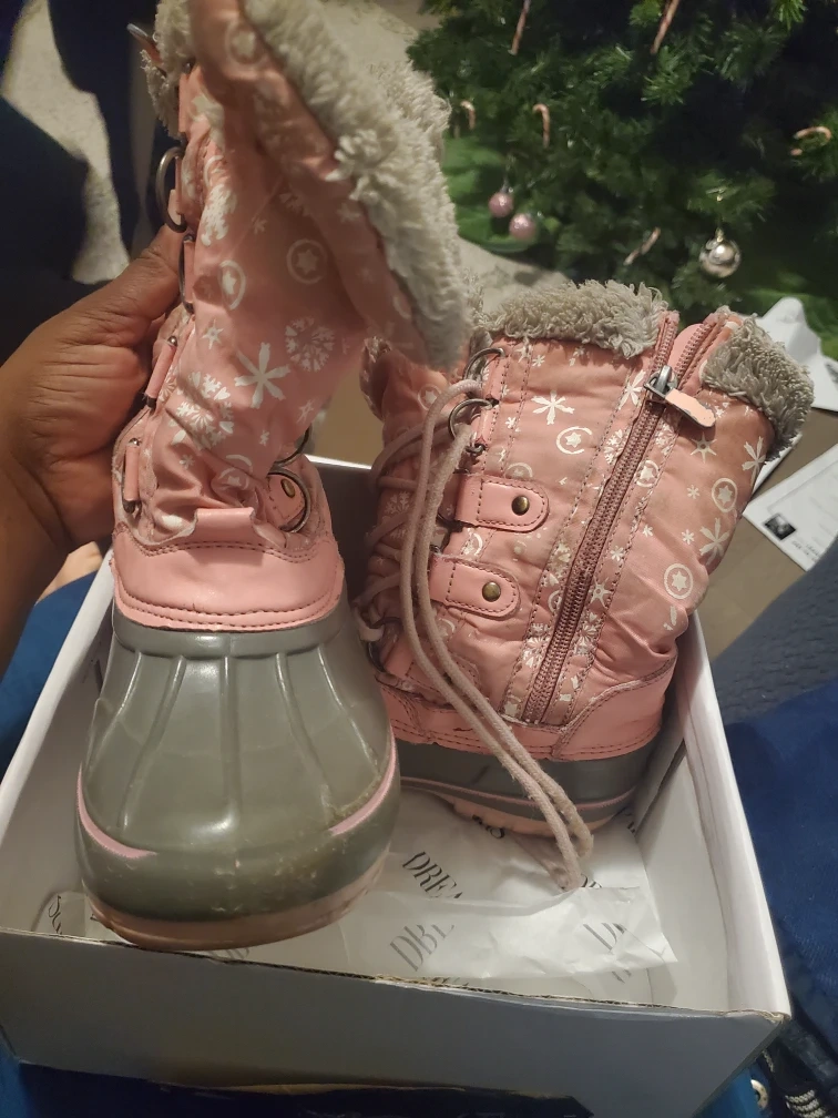Size 12, These Dreampairs winter boots are perfect for keeping your little one's feet warm and dry! They are pink with a cute snowflake pattern and have a grey sole. They also come with the original box!