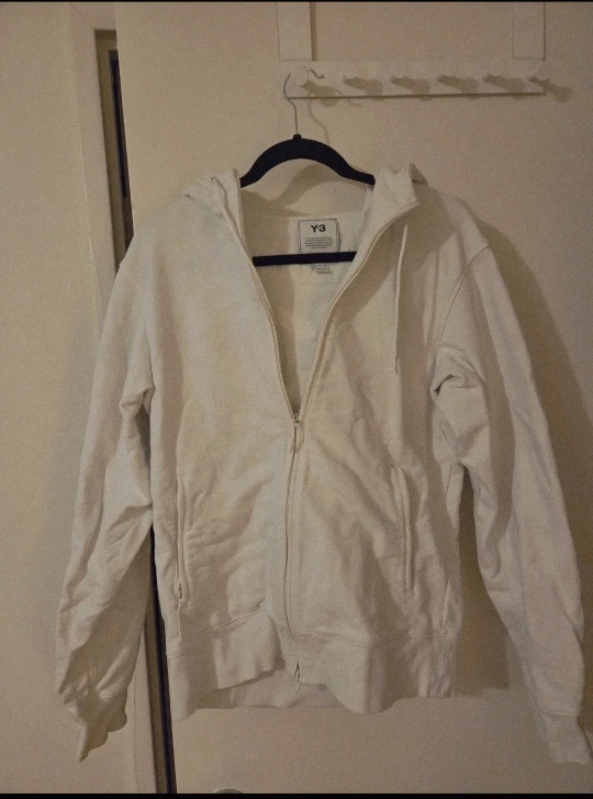 Selling a Y-3 white zip-up hoodie. It's in great condition and ready for a new owner! The hoodie features the Y-3 logo on the back. Perfect for layering or wearing on its own.