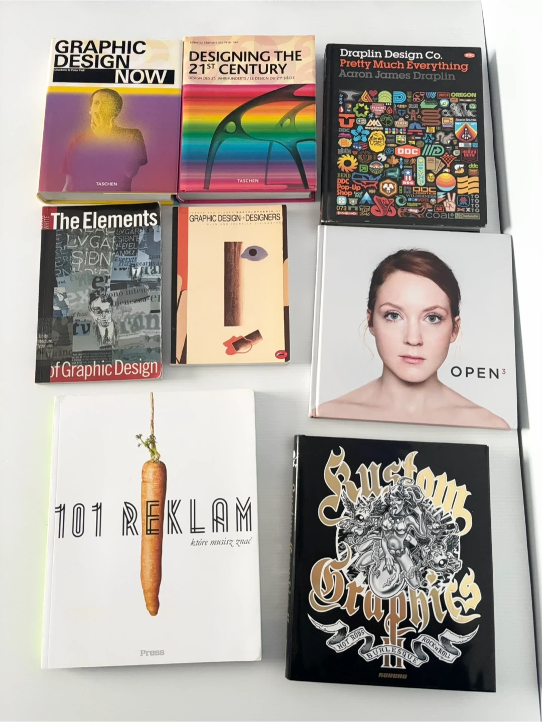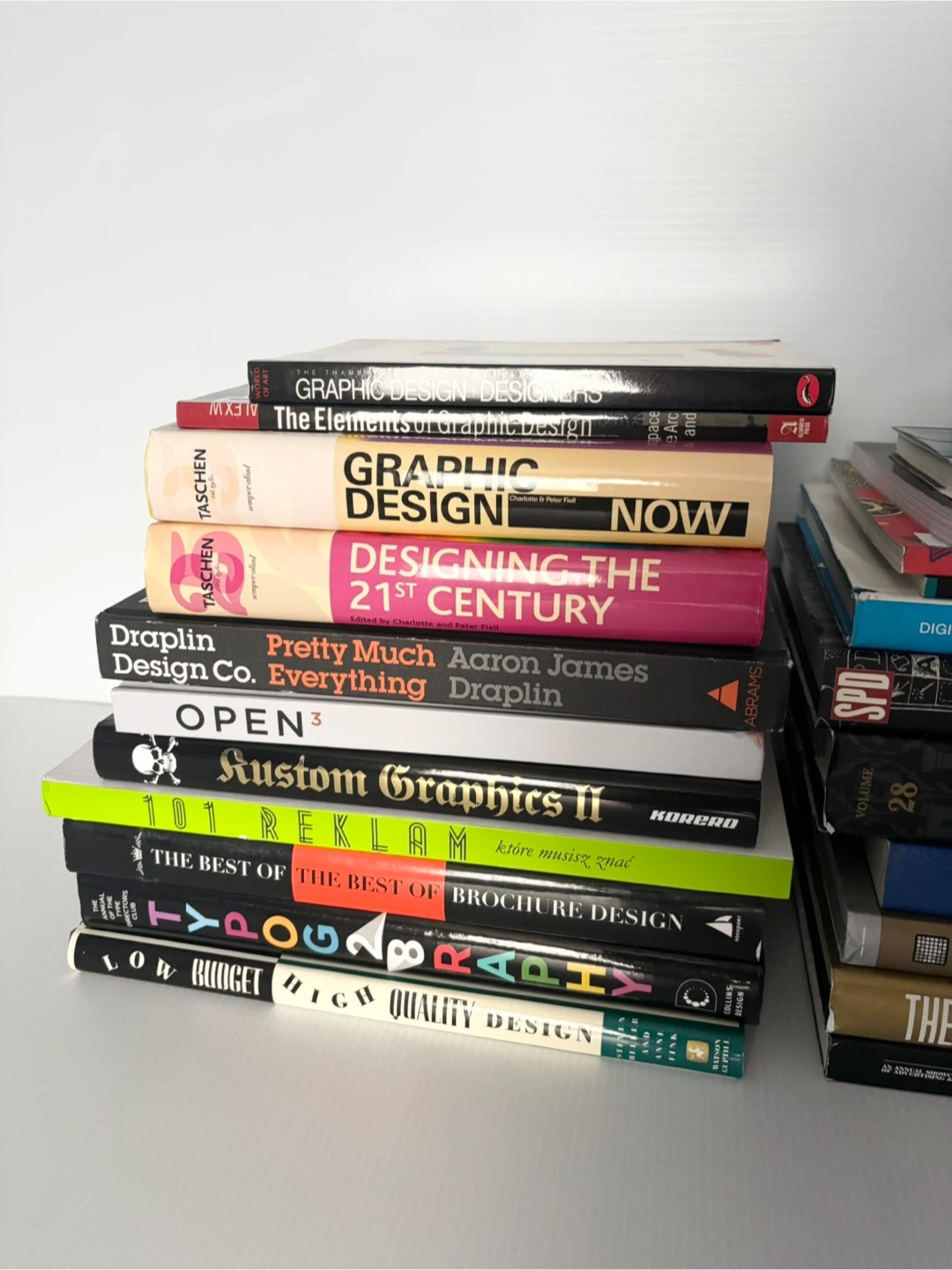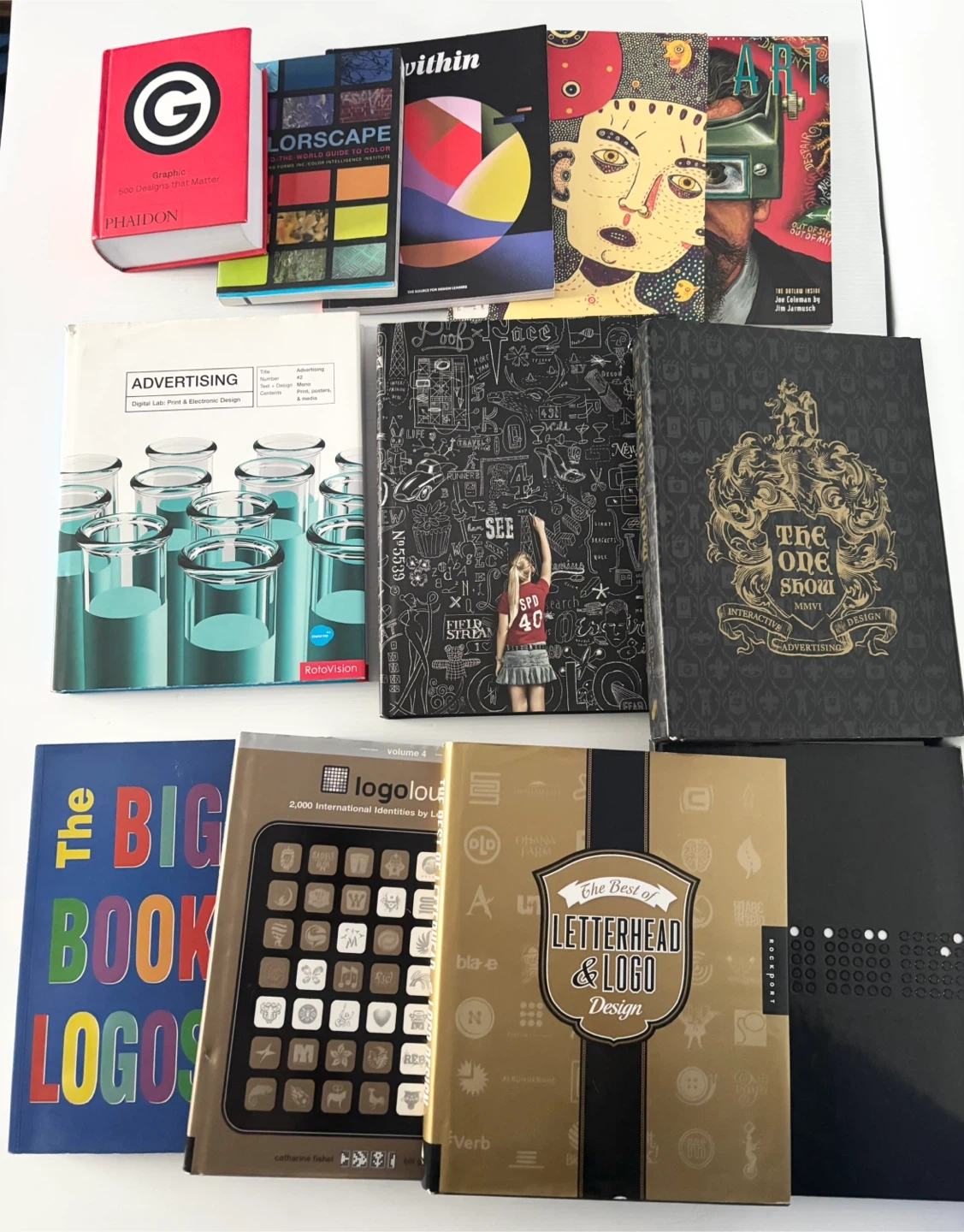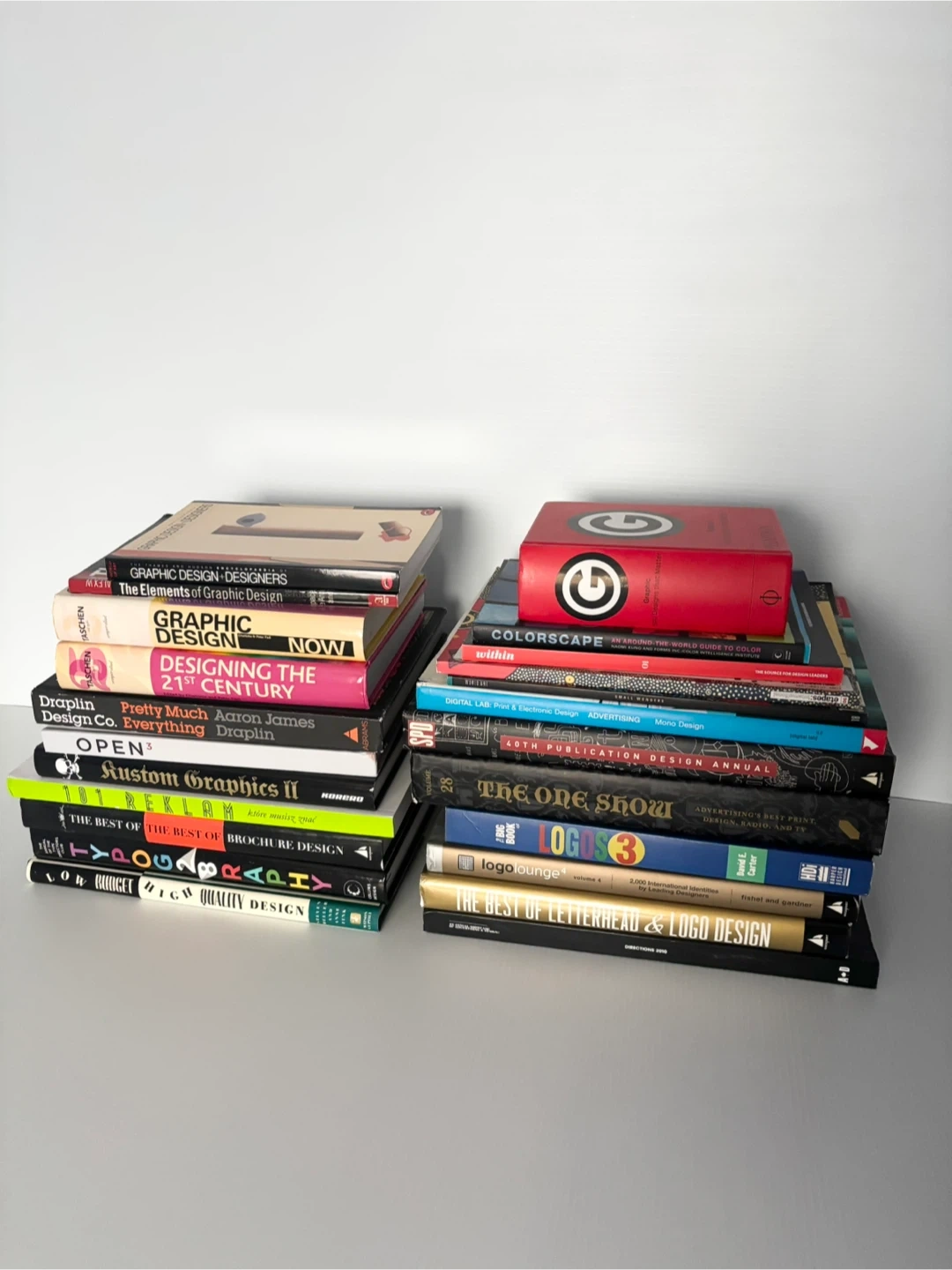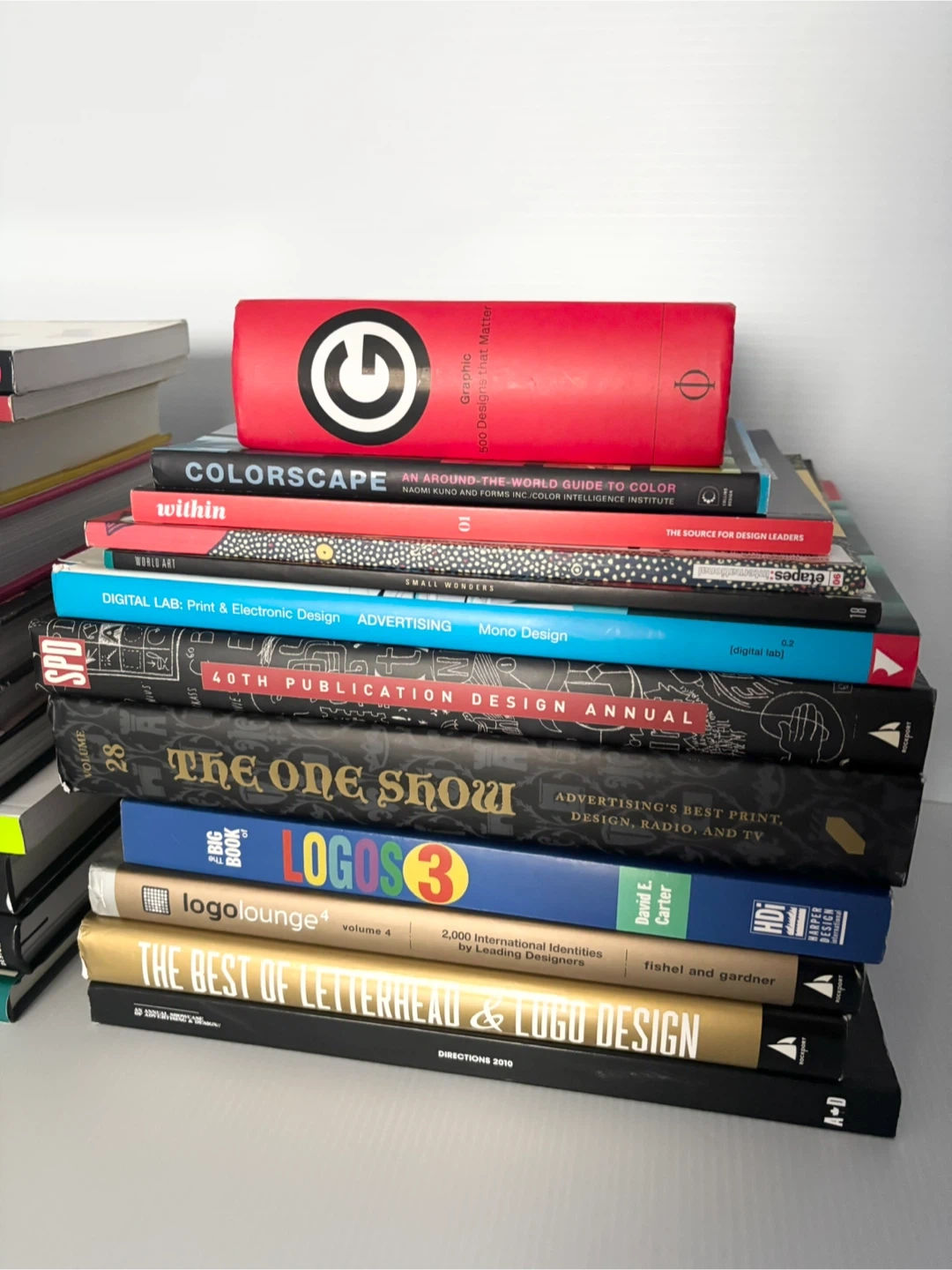 A large stack of Graphic design art typography and art direction books. Some books are older and show some wear.