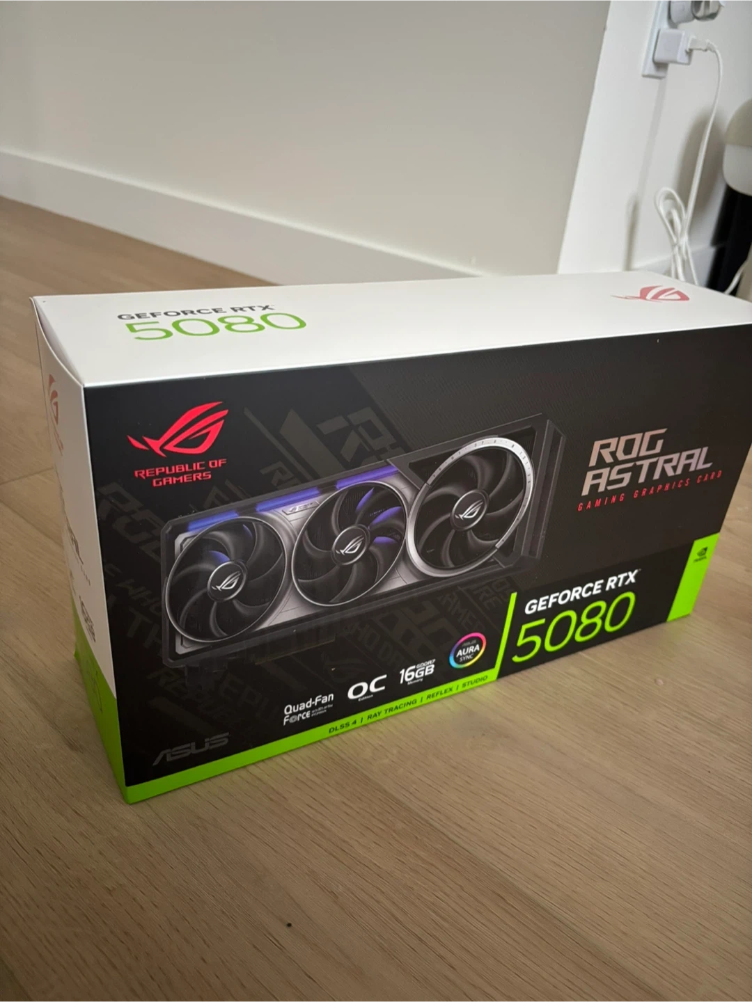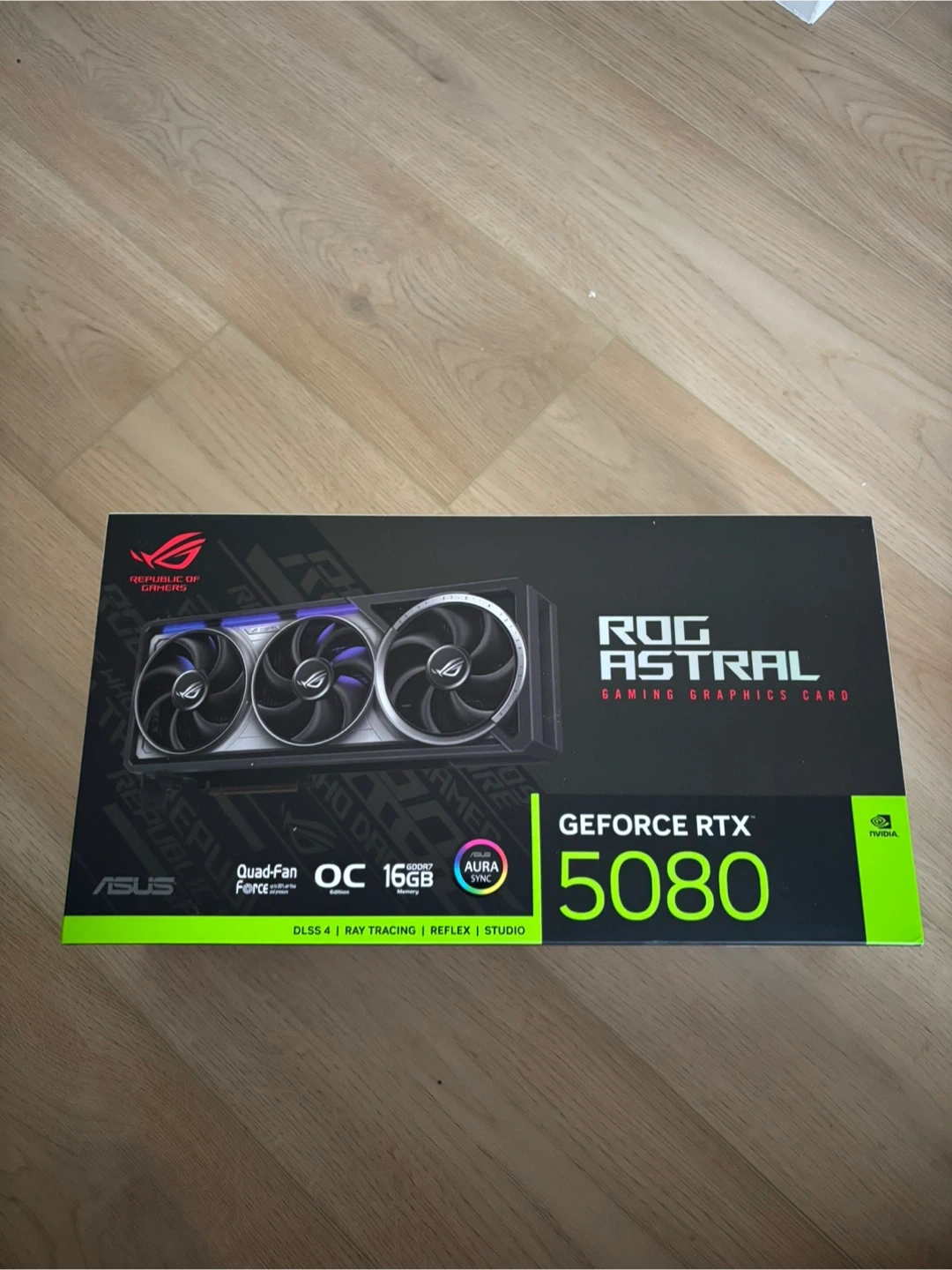 Selling a brand new ASUS ROG ASTRAL GeForce RTX 5080 graphics card with 16GB of memory! It features a Quad-Fan design and supports DLSS 4, Ray Tracing, and Reflex Studio.