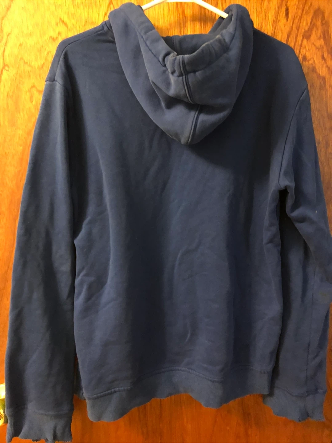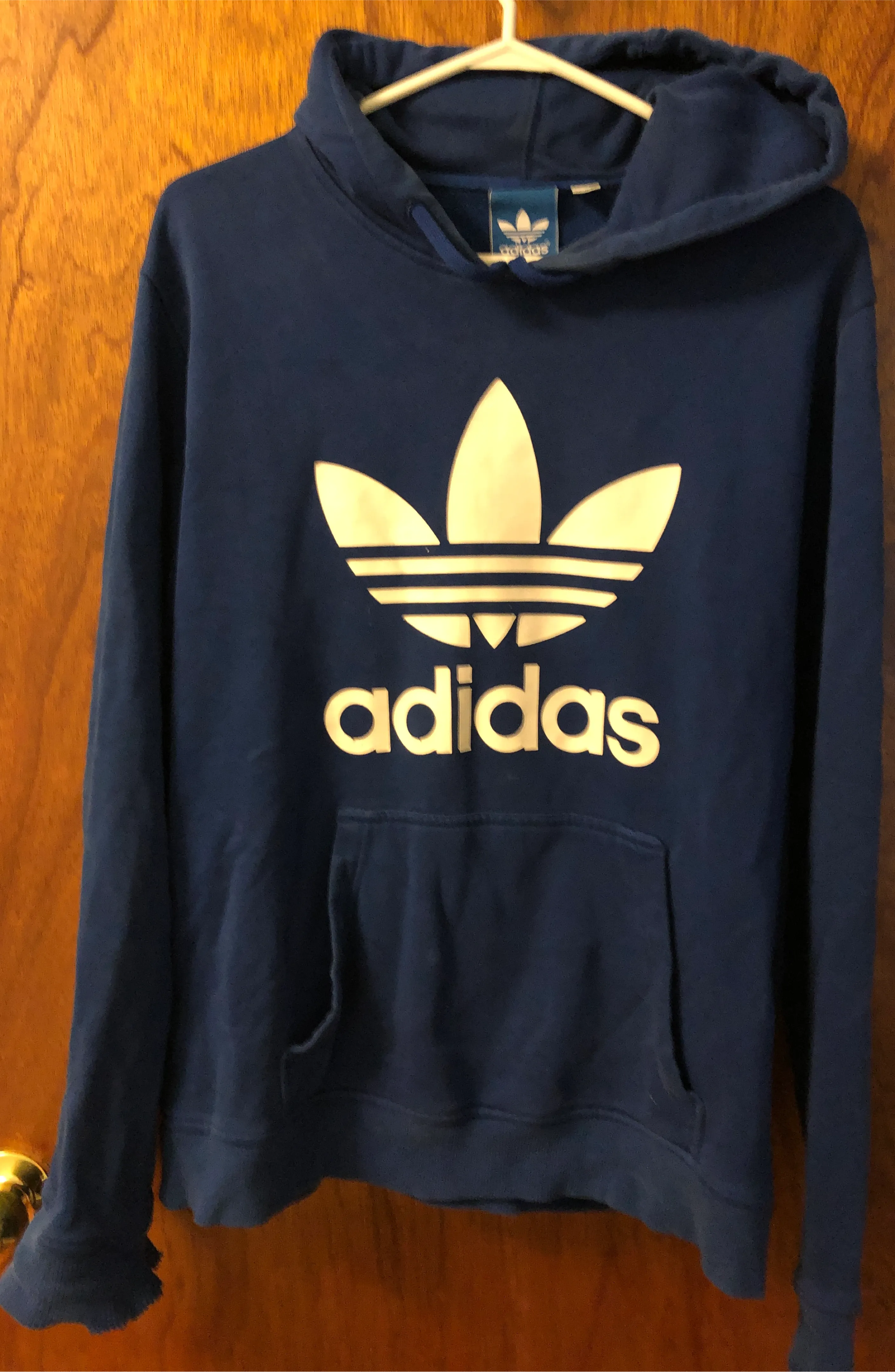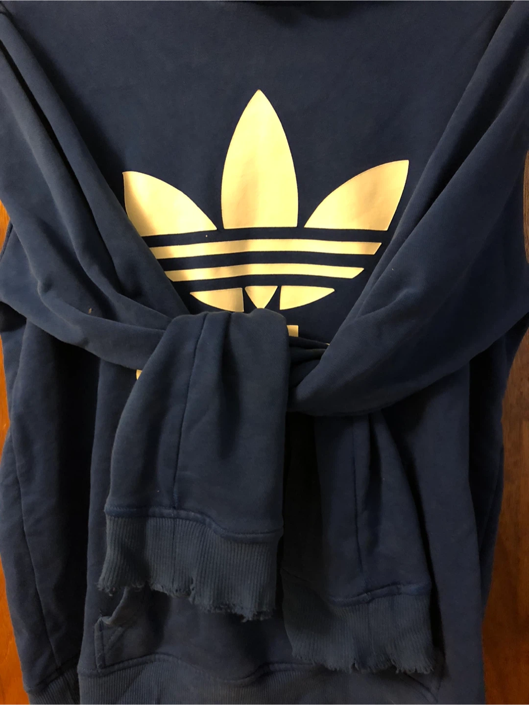 Selling an Adidas hoodie in blue! It's a size medium and has the classic Adidas logo on the front. It's perfect for casual wear or workouts. Only the cuffs are damaged see in the picture. Other than that all okay ๐