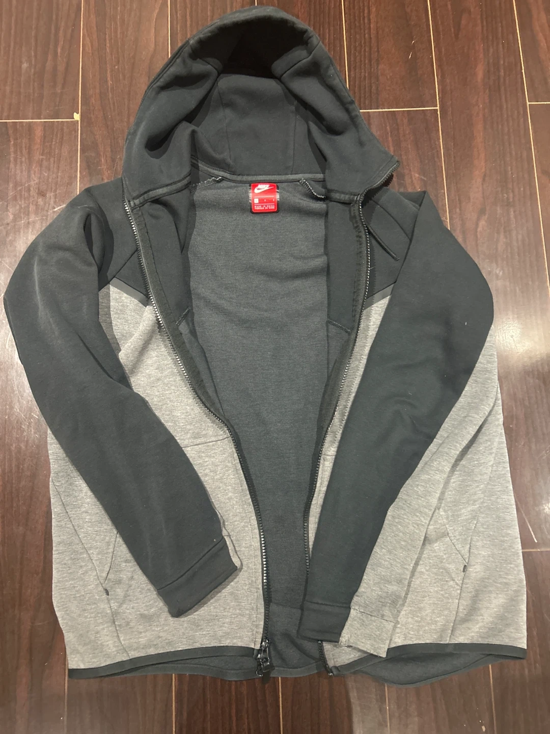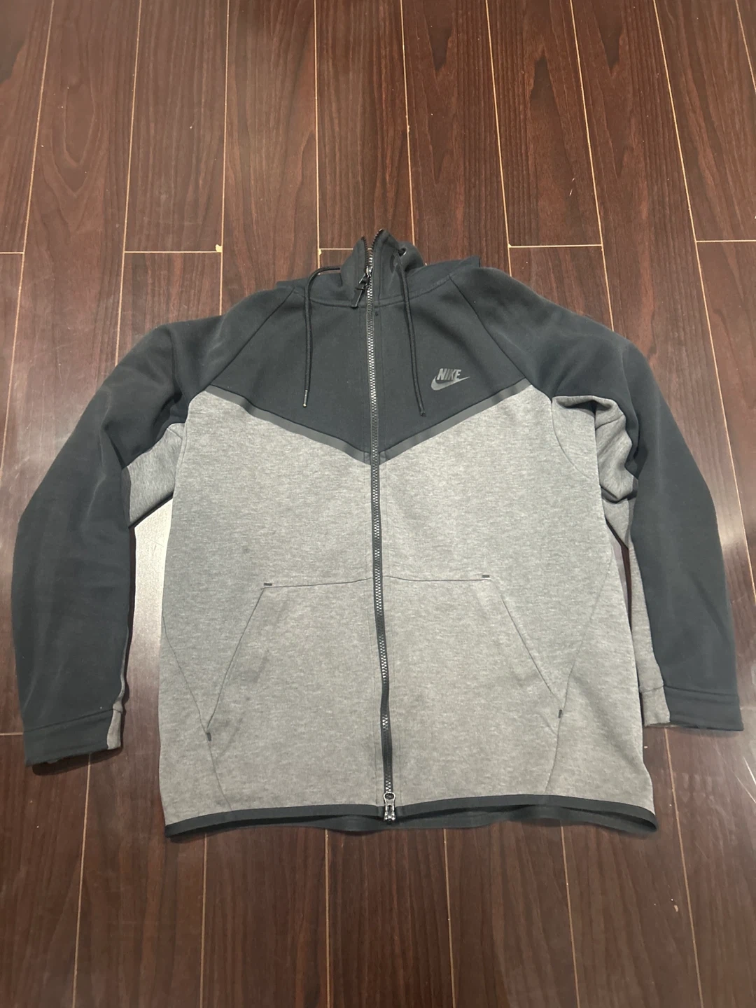 Selling a Nike Tech Fleece full-zip hoodie in grey and black. It's in great condition and perfect for layering or wearing on its own. The tech fleece material is lightweight and comfortable. A stylish and functional addition to your wardrobe!