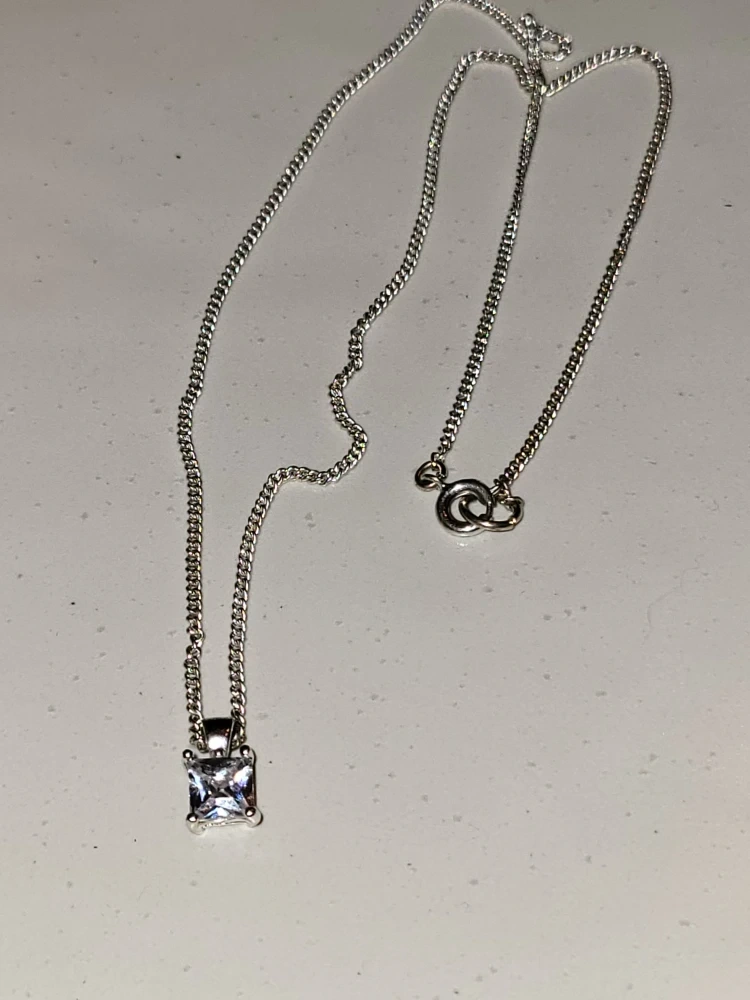 Selling a dainty silver necklace featuring a square cubic zirconia pendant. It's in great condition and would be a lovely addition to any outfit.
