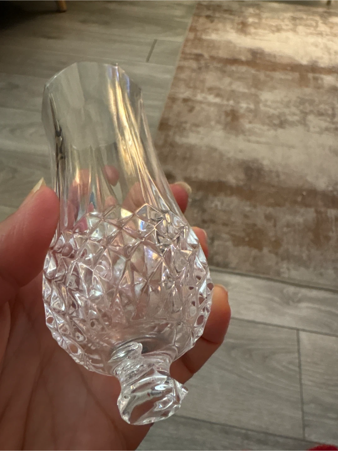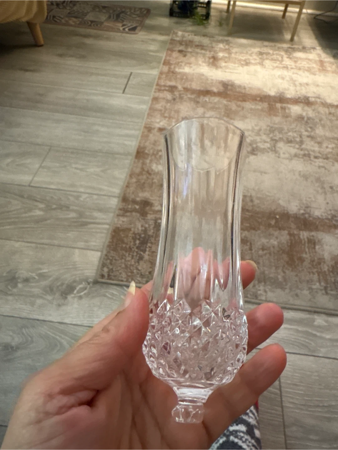 Selling a lovely crystal glass It has a beautiful textured pattern on the lower half, adding a touch of elegance to any room
