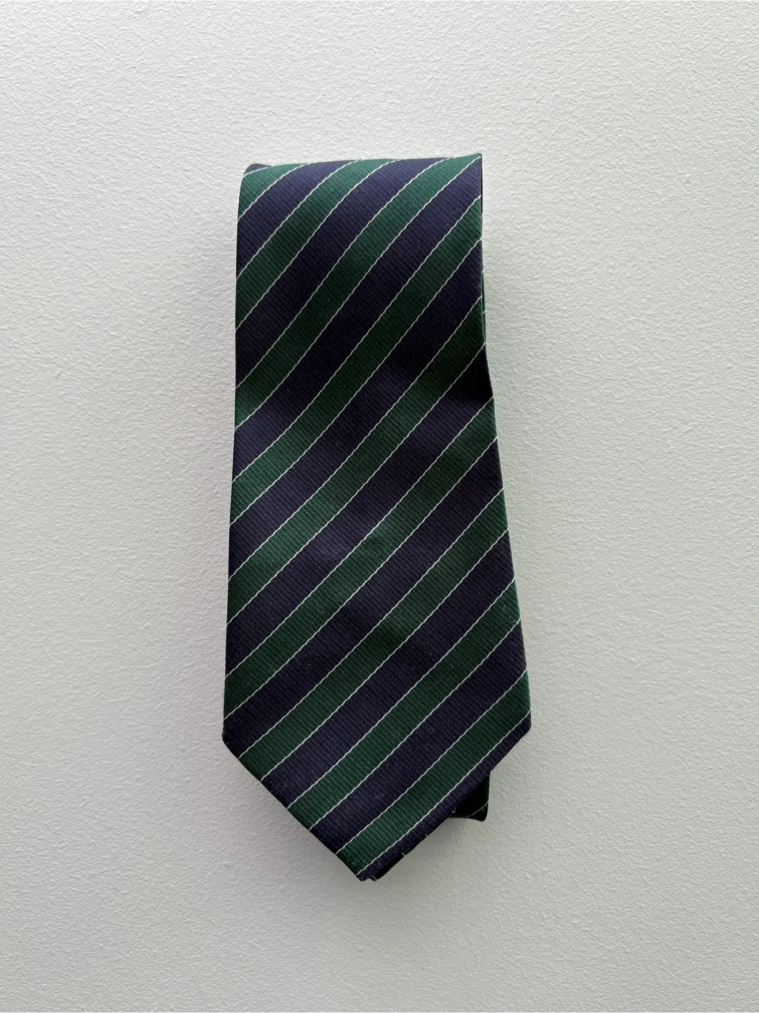 Classic striped necktie in a stylish combination of green and navy. Perfect for adding a touch of sophistication to any outfit!