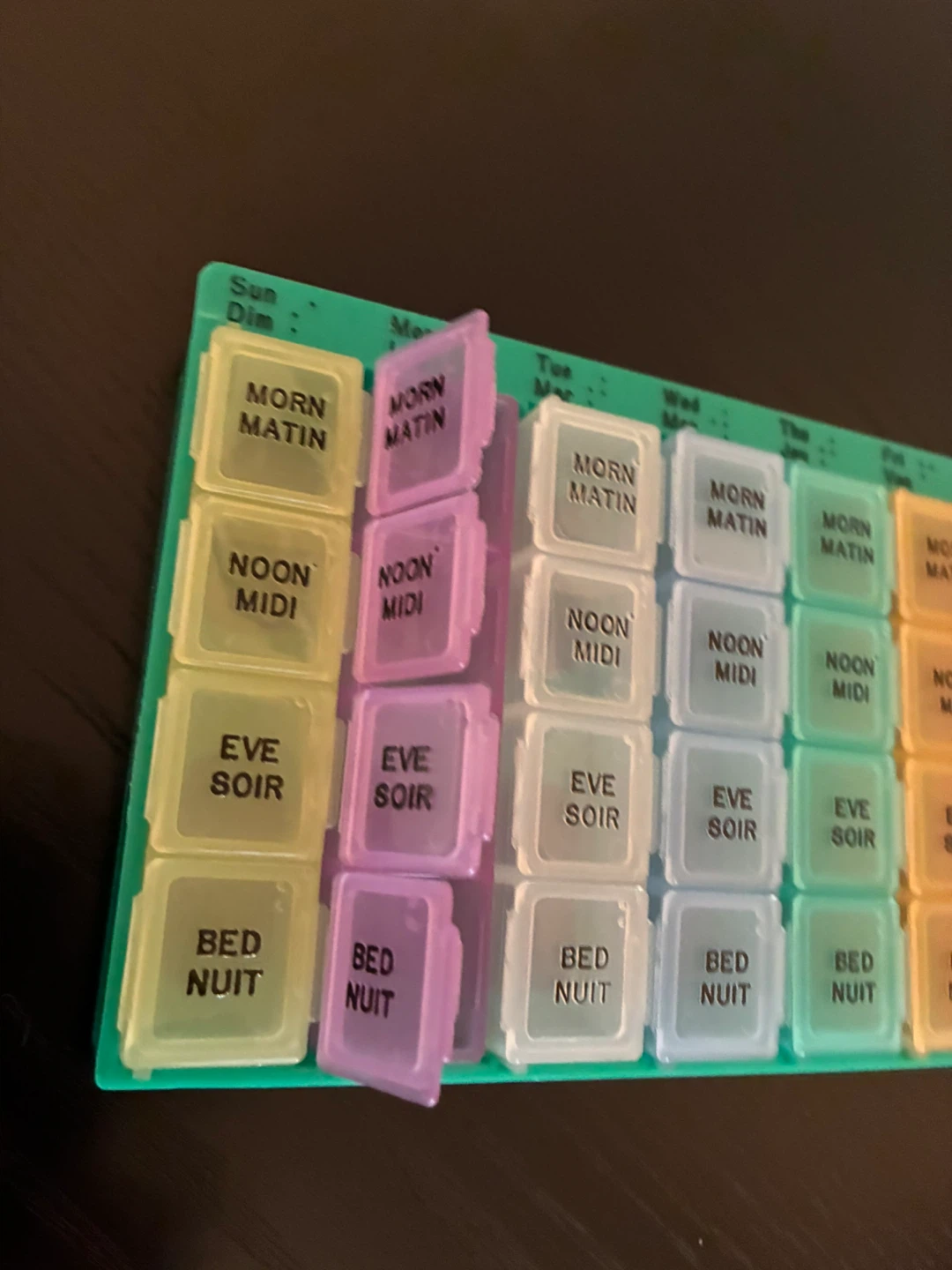 Pill organizer with compartments for morning, noon, evening, and bedtime for each day of the week. It's in great shape and ready to help keep your medications organized!