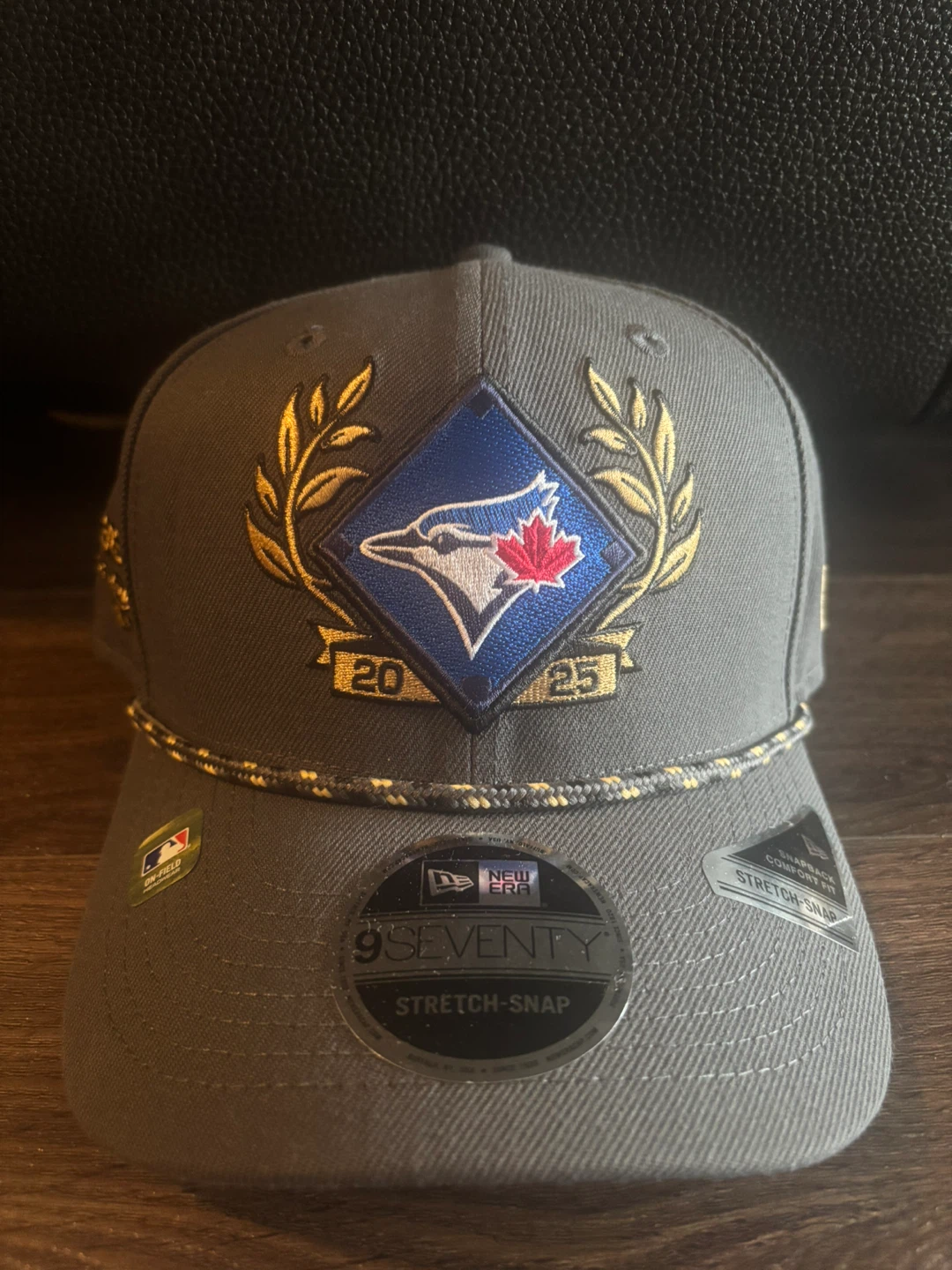 Selling a Toronto Blue Jays 2025 Postseason hat! It's a 9Seventy Stretch-Snap style. The hat is grey with gold detailing, including the Postseason embroidery on the side and the Blue Jays logo on the front. Brand new condition!