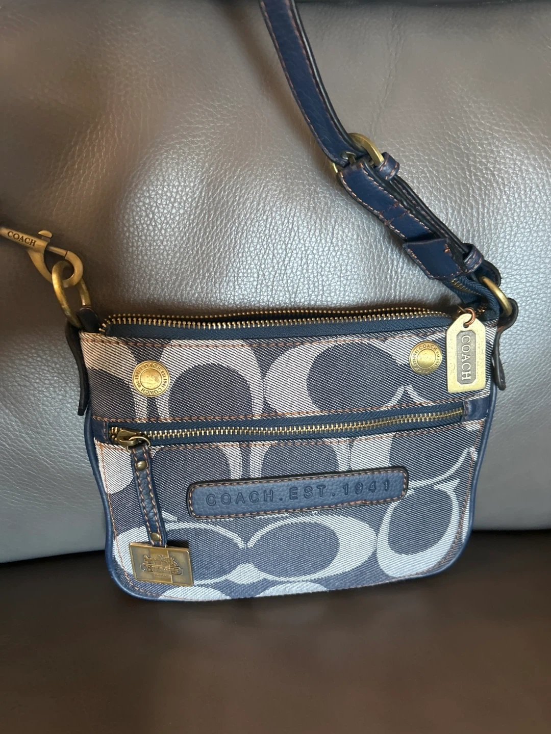 Selling a cute Coach crossbody bag in a denim signature pattern!