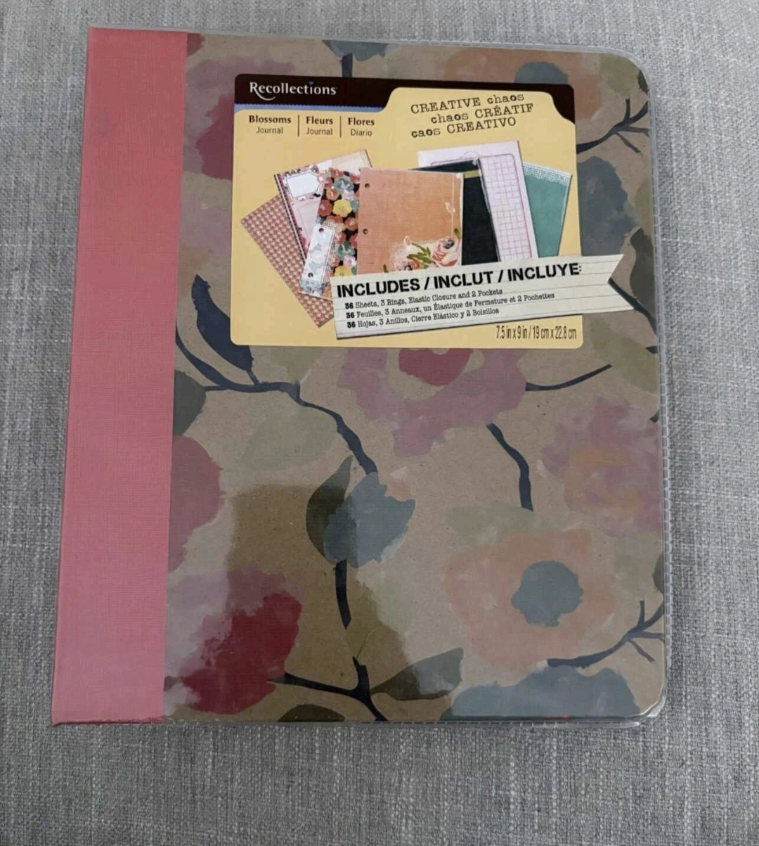 Brand new Recollections journal. It's a Creative Chaos Blossoms journal that includes 56 sheets, 3 rings, one elastic closure and 8 pockets. It measures 7.5 in x 9 in / 19 cm x 22.8 cm.