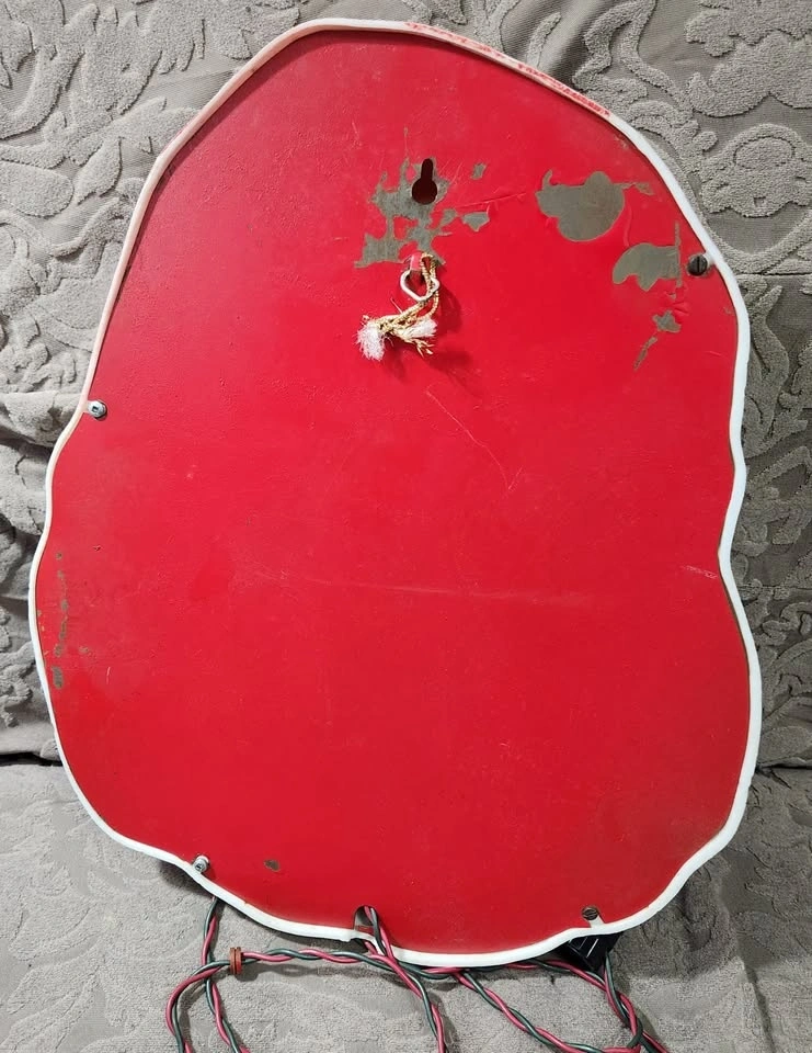 This is a vintage, hard plastic Blow Mold Light-Up Santa Face, most likely by NOMA from the 1960s. It measures 15 inches in height and is in perfect working order. There are a couple of areas where the paint has slightly worn off, but overall it is in very nice condition. The back is metal and the face features hand painted details such as holly leaves and eyes. The cord and the plug in are in perfect condition. A perfect vintage Christmas wall decoration. A wonderful addition to your vintage or mid-century modern Christmas decoration or collection. Sold as is.