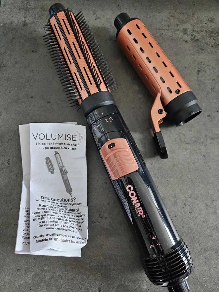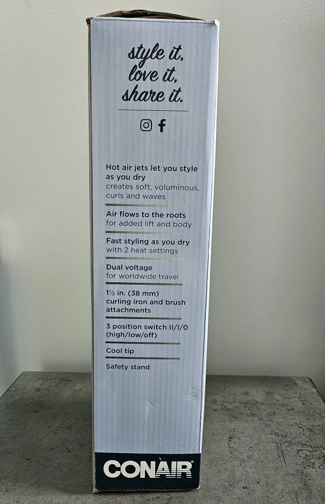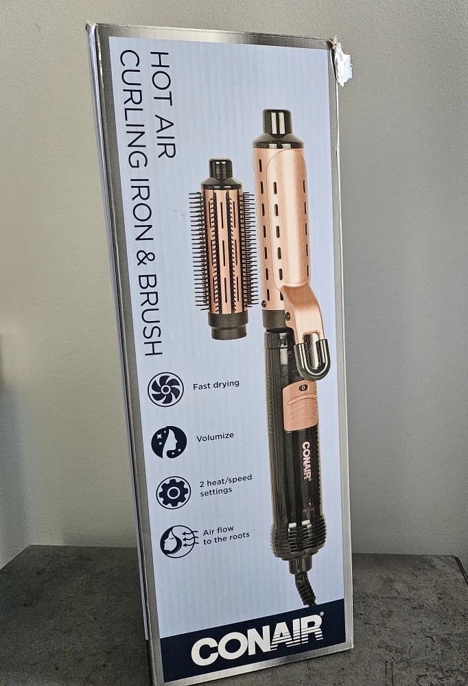 Get ready to volumize with this Conair hot air curling iron and brush! It features fast drying and 2 heat/speed settings. Air flows to the roots for added lift and body. It also has dual voltage for worldwide travel and a cool tip for safety. Included is a 1 ½ in. (38 mm) curling iron and brush attachments. Box included