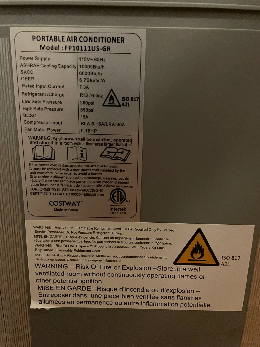 Selling a Costway portable air conditioner, model FP10111US-GR.