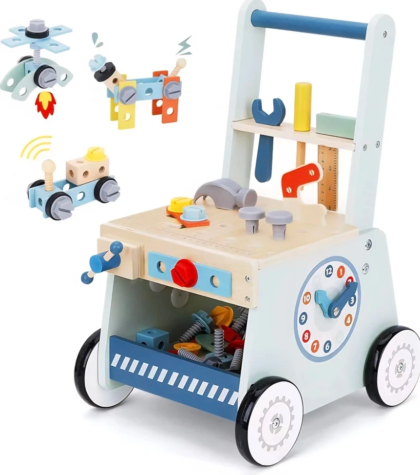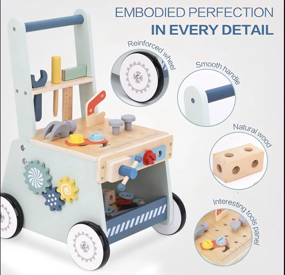 -This wooden baby walker doubles as a tool bench toy, perfect for little ones who love to build and explore! It features reinforced wheels and a smooth handle for easy maneuvering. The natural wood construction adds a touch of classic charm, and the interesting tools panel keeps kids engaged. A great way to encourage creativity and motor skills development