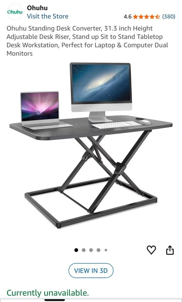 Buy & SellStanding Desk ConverterStanding Desk Converter$85Couple surface scratches on the top but never really used it. Details like dimensions in fourth pic.WHERE TO MEETCheck LocationView MapSELLERAngusHeadon Forest50 reviews0 chats·0 favorites·0 views