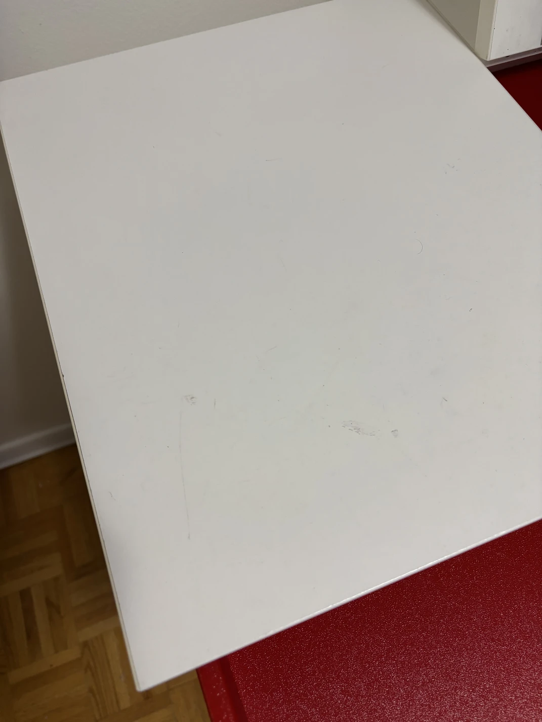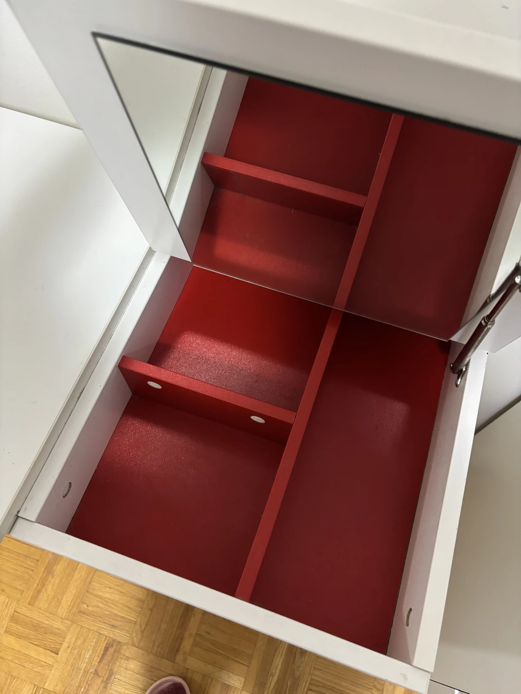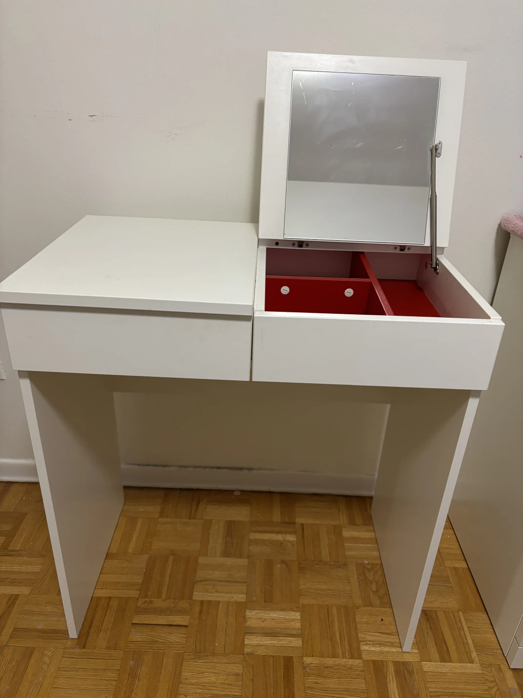 Selling a white vanity makeup table with a mirror. It has a red interior and a lift-top design to reveal storage compartments. It's perfect for organizing your makeup and getting ready!