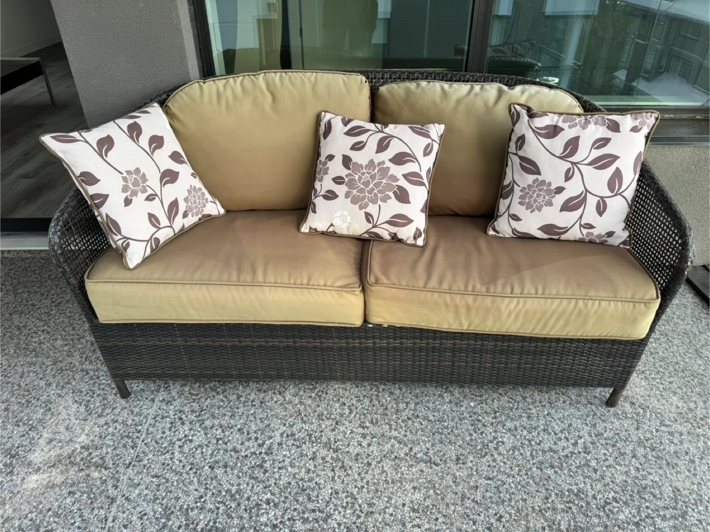 - A brown rattan sofa with beige cushions and floral pillows : $150