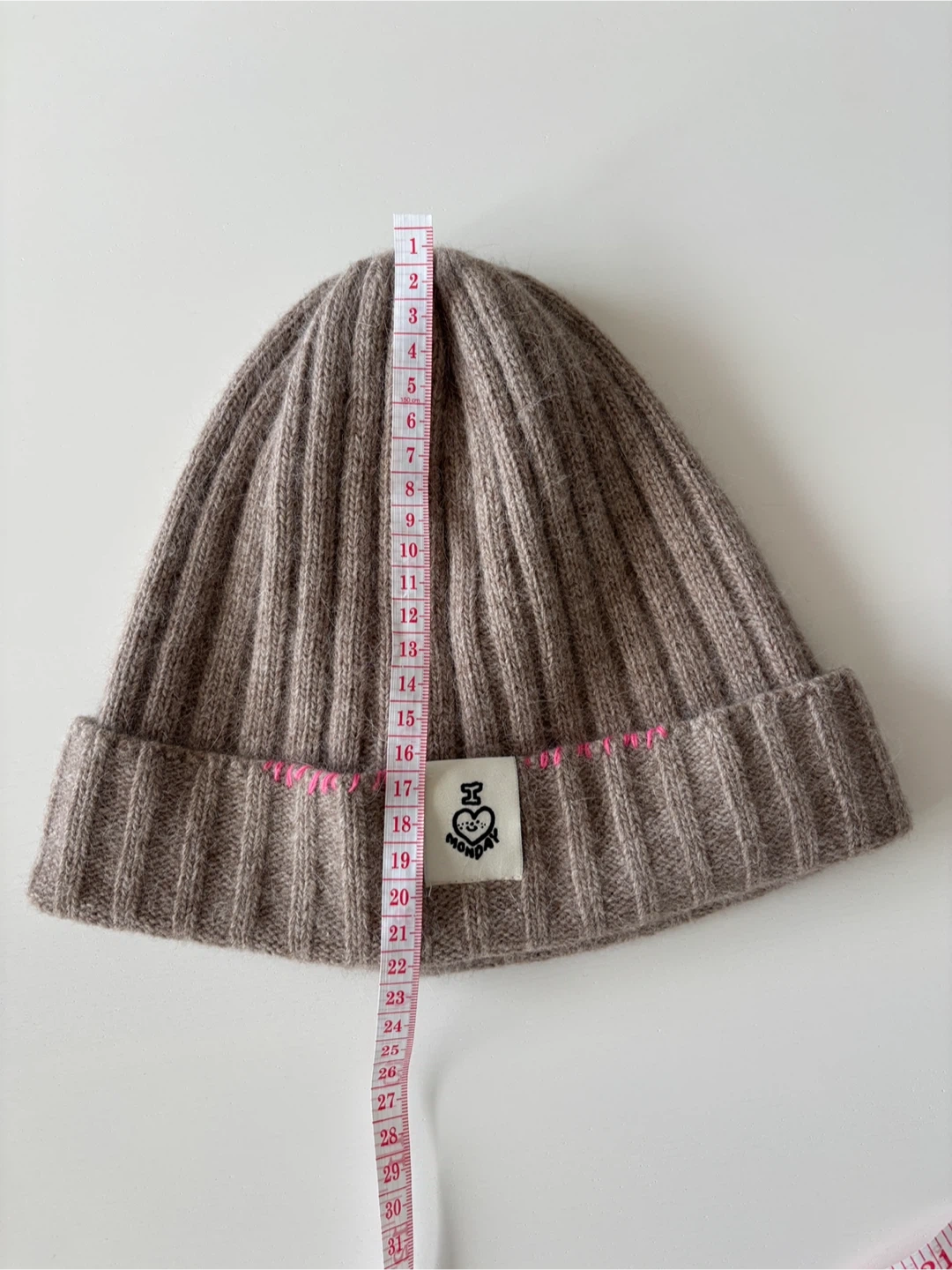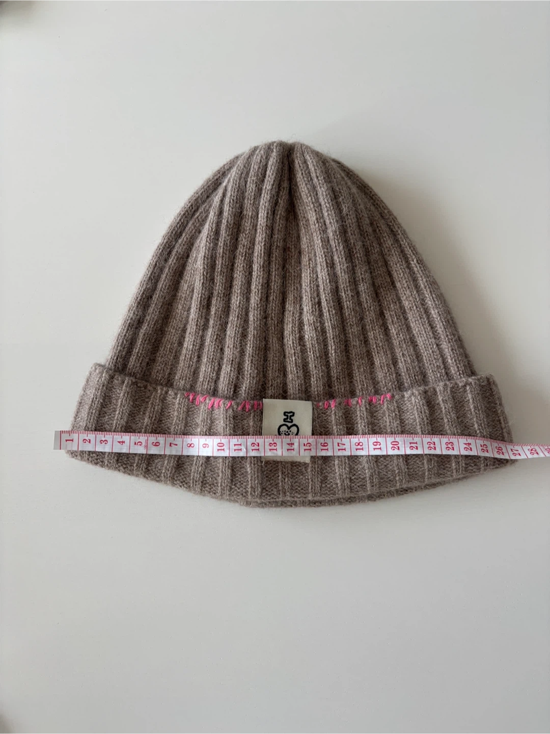 Cozy and warm beanie hat! It's a blend of wool, angora, and rayon, so it's super soft and comfy. The hat measures approximately 20cm in height and 26cm in width.