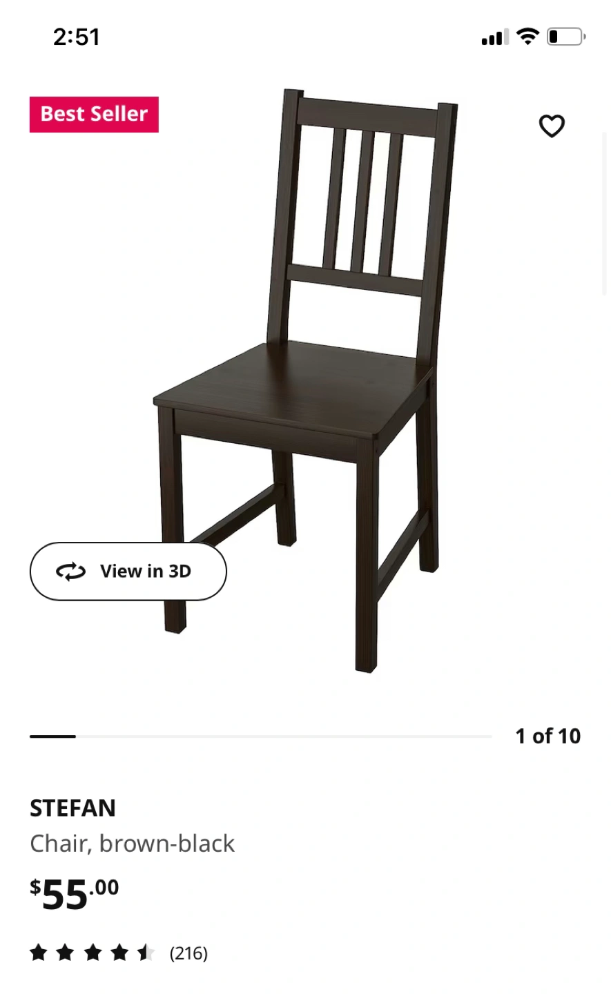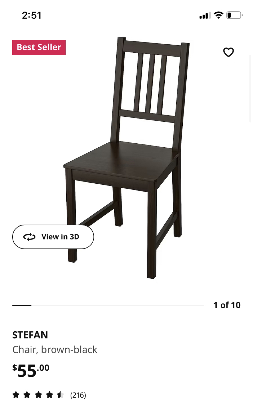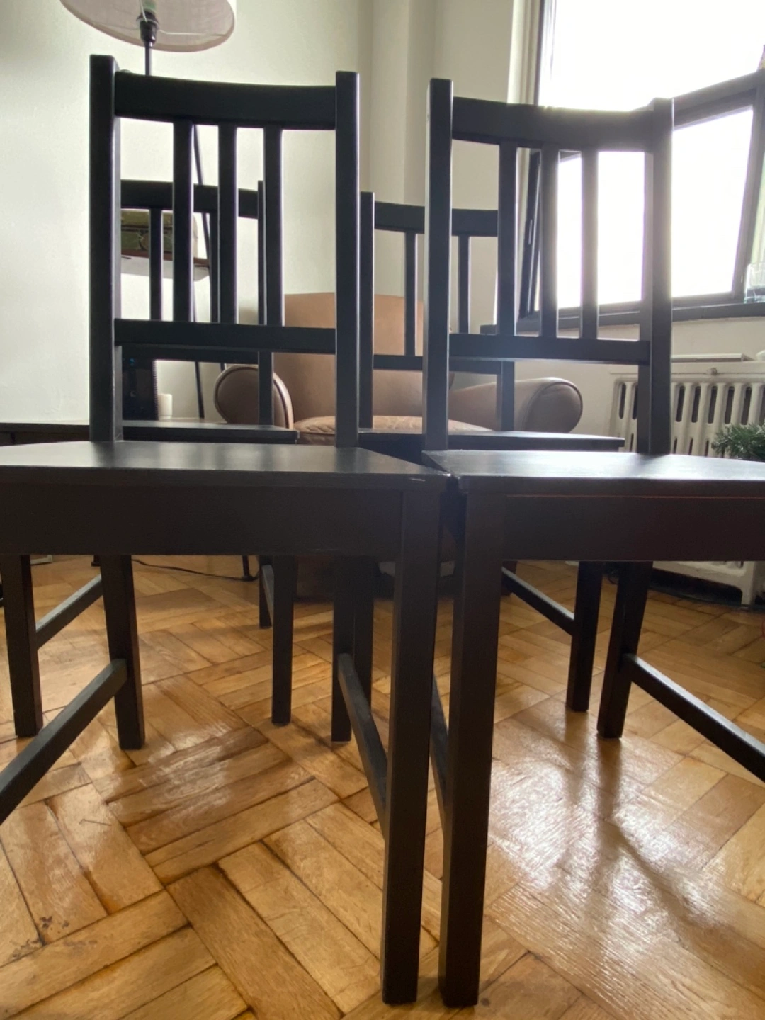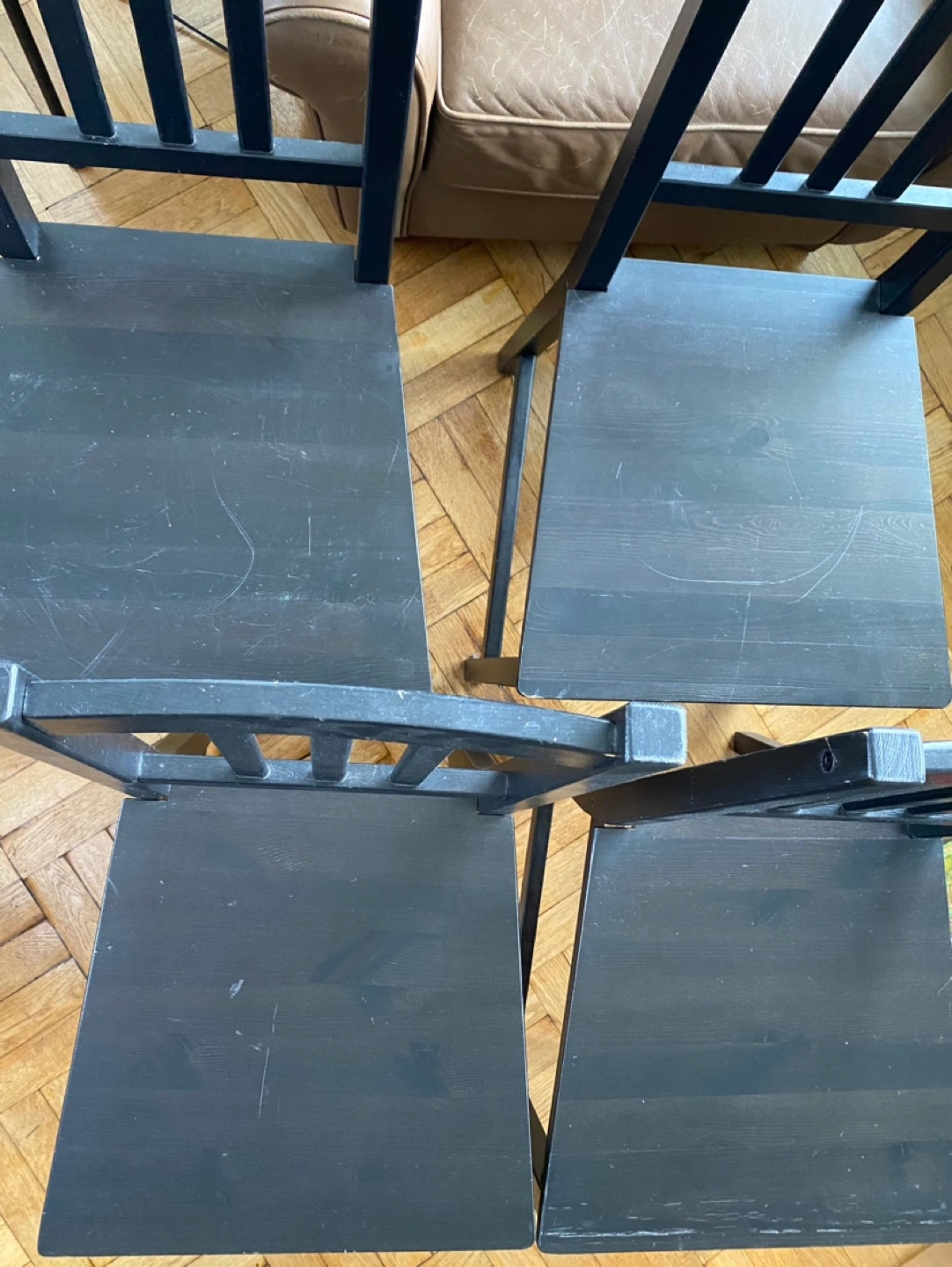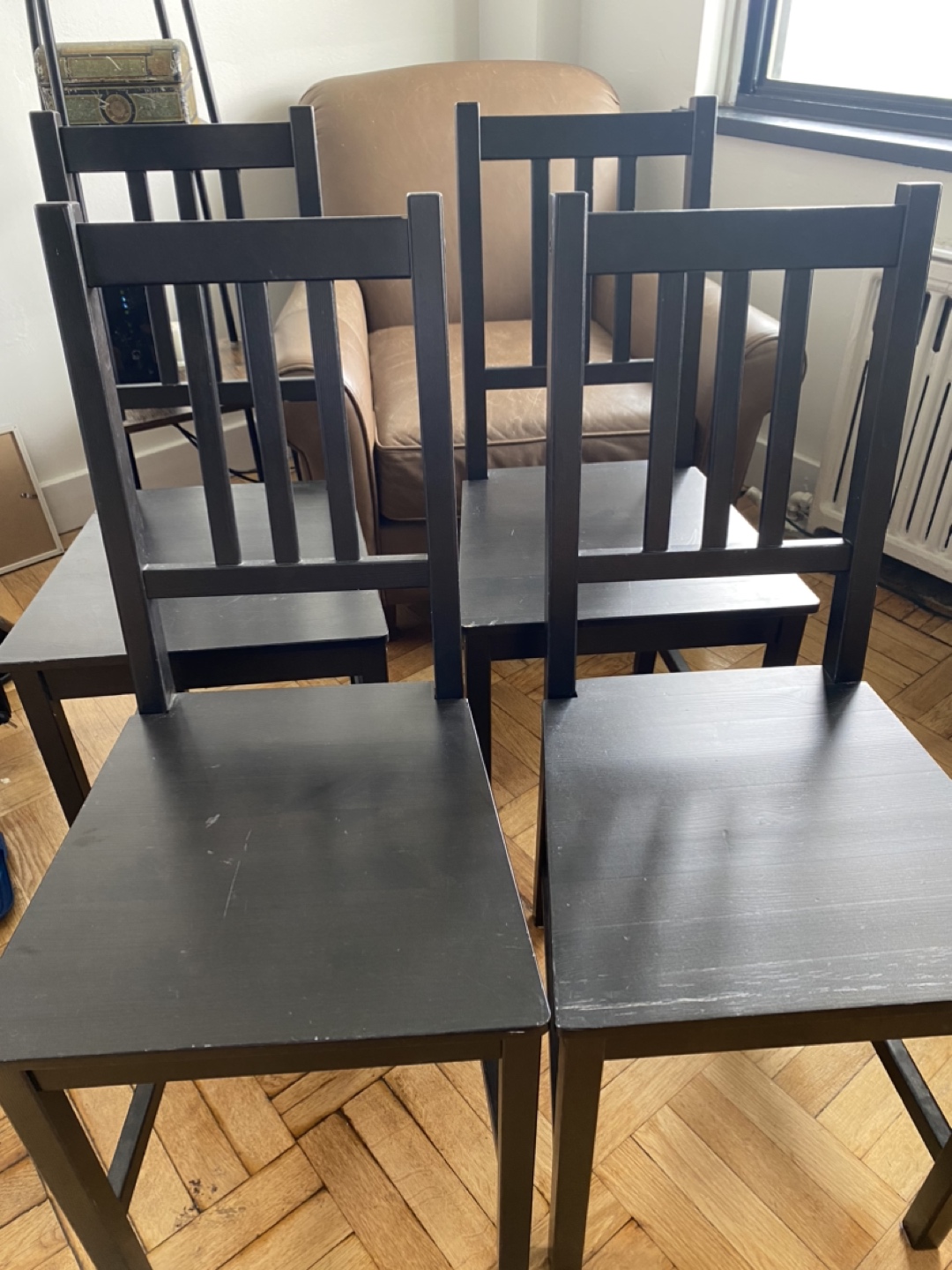 Solid hardwood STEFAN chairs from IKEA. Some scratches, shown in bright sunlight, could use a repaint but not too noticeable when tucked under a table. Sturdy & match almost anything. Only getting rid of them as I’m moving out of province. Bought for $55 ea, ($220 total), selling all 4 for $85.