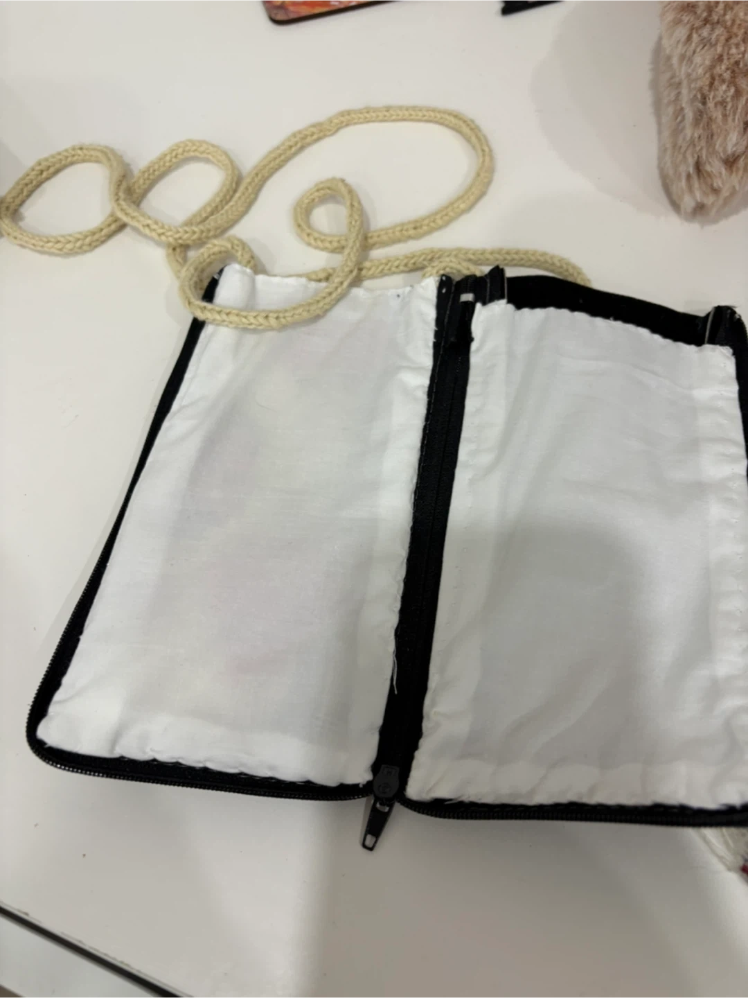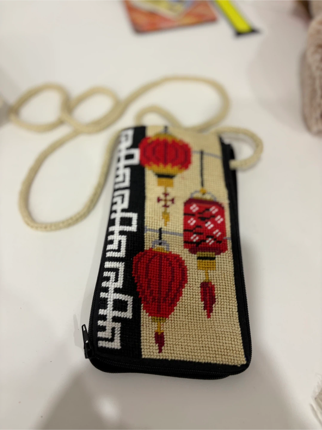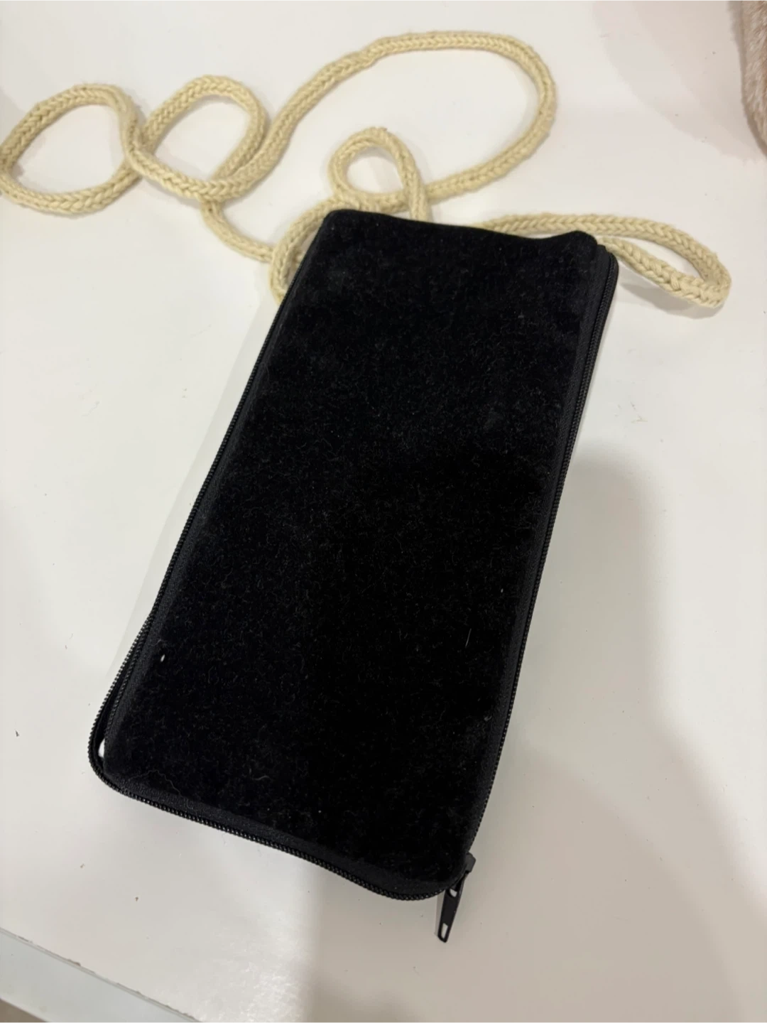 This is a handmade crossbody bag with a unique lantern design! It features a black velvet back and a zipper closure. The strap is made of a sturdy, braided cord.