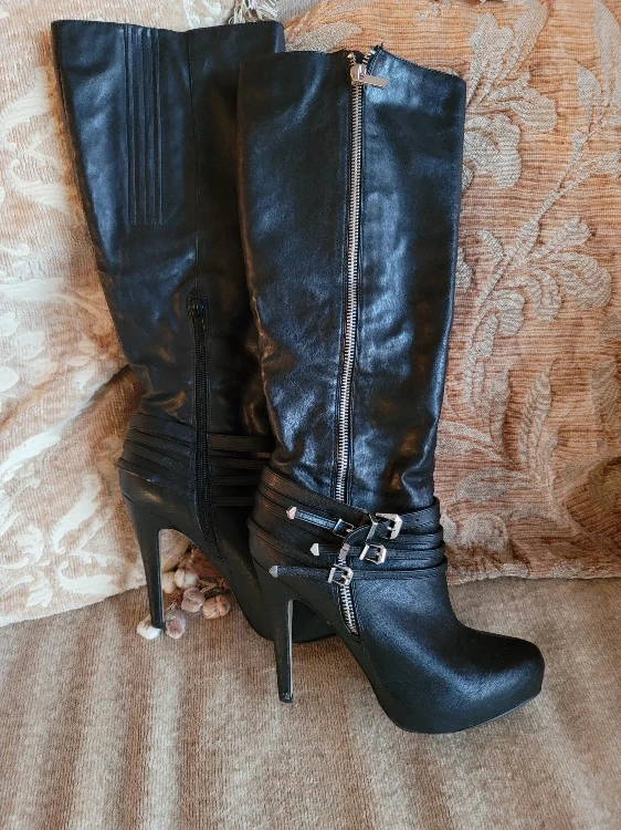 Selling a pair of stylish ALDO black leather heeled boots in size 7. These boots feature a sleek design with zipper and buckle details. They're in great condition and ready for a new owner!