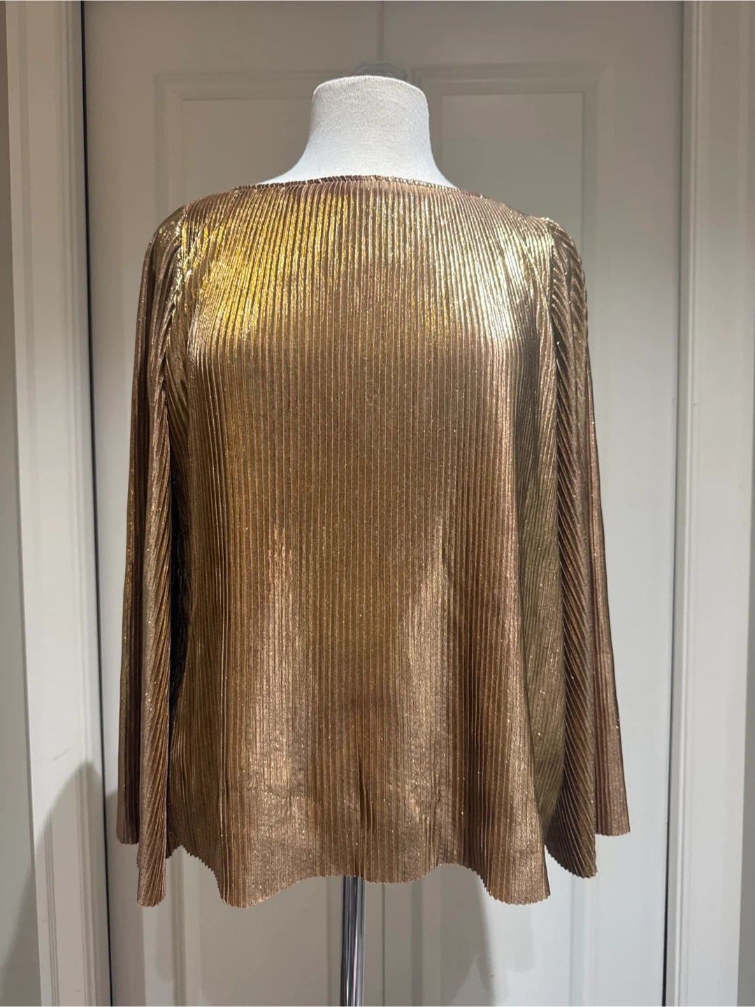 Here's a lovely gold coloured plissé blouse! It has long dramatic wide sleeves and a round neckline. The material has a beautiful shimmer, perfect for dressing up or adding a bit of shine to your everyday look. From 2000’s. Perfect for holidays.