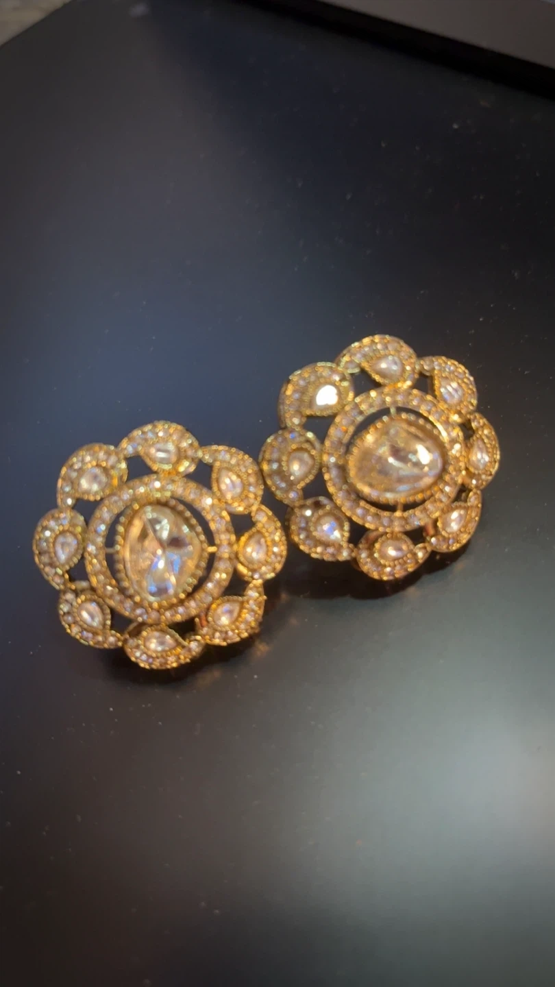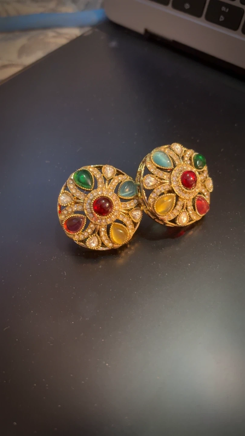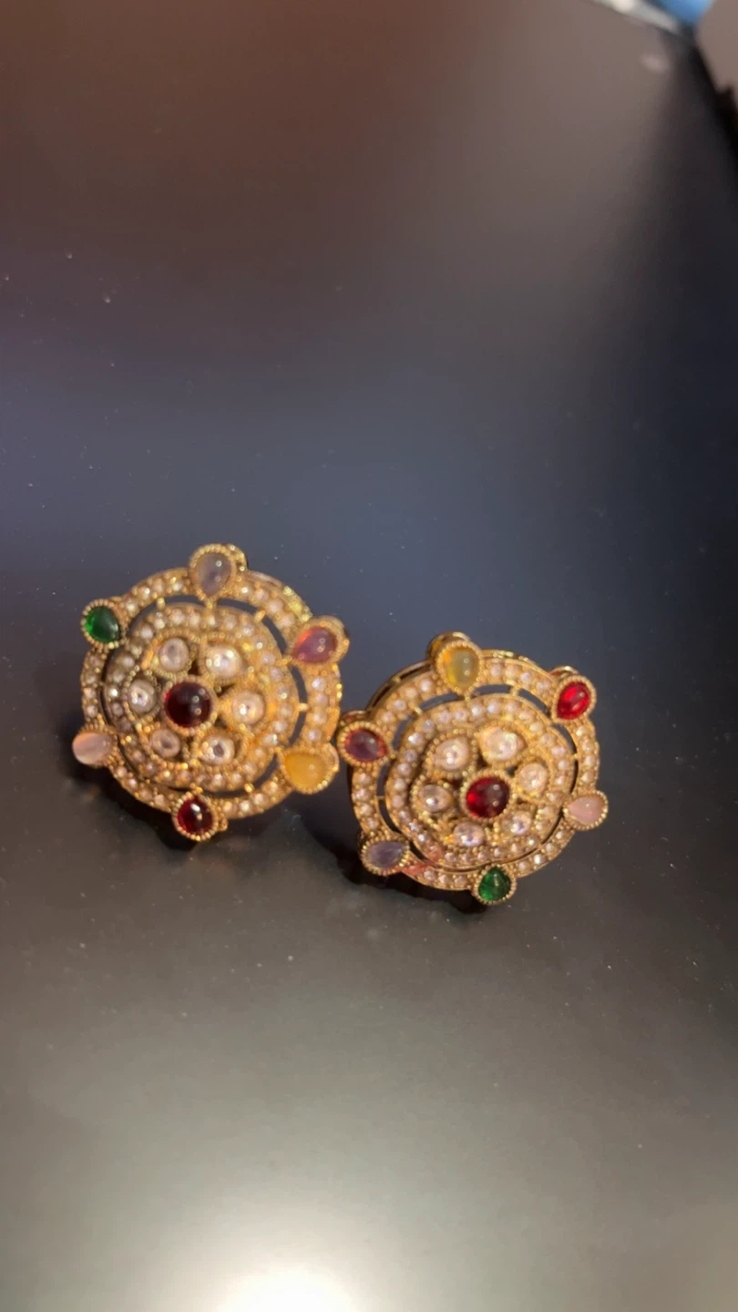 Selling a pair of gold-tone stud earrings. They have a lovely floral design with colourful gemstones and faux pearls. Perfect for adding a touch of sparkle to any outfit!