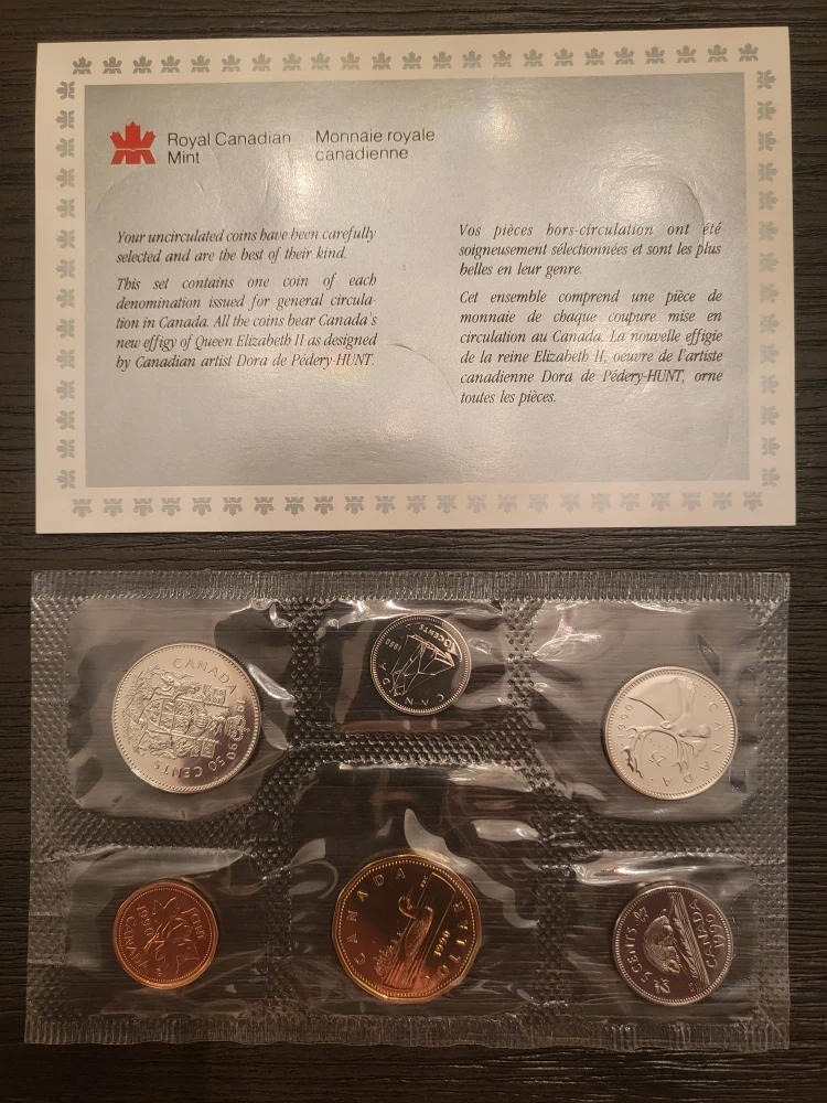 Selling a 1990 Royal Canadian Mint uncirculated coin set. This set contains one coin of each denomination issued for general circulation in Canada, all the coins feature Canada's new effigy of Queen Elizabeth II as designed by Canadian artist Dora de Pédery-Hunt.