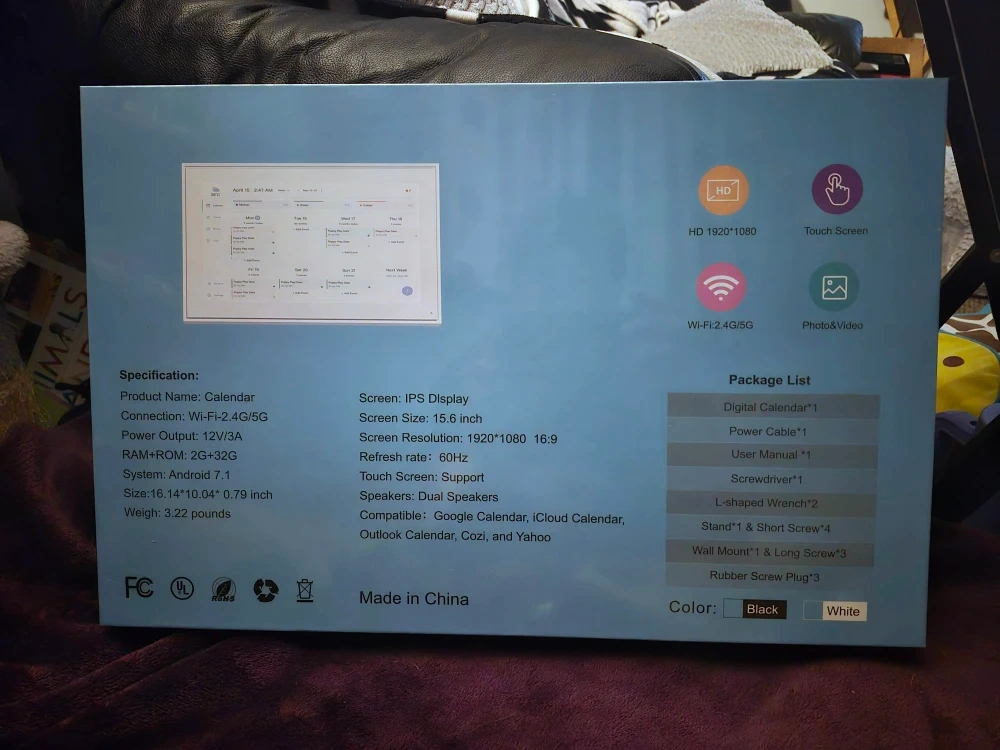 Selling a brand new digital calendar still in its original box! The screen size is 15.6 inches with a resolution of 1920*1080. It supports Wi-Fi 2.4G/5G and comes with dual speakers. Compatible with Google Calendar, iCloud Calendar, Cozi, and Yahoo! Includes the digital calendar, power cable, user manual, screwdriver, L-shaped wrench, stand and short screw, wall mount and long screw, and rubber plug. There is no name brand associated with this calendar.