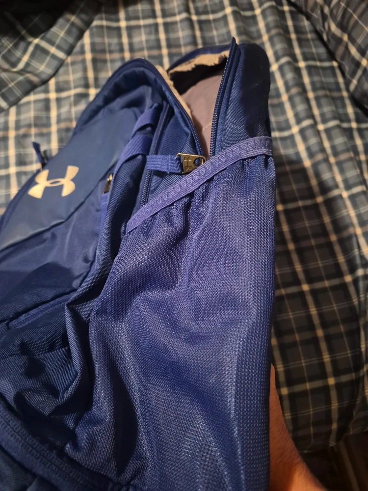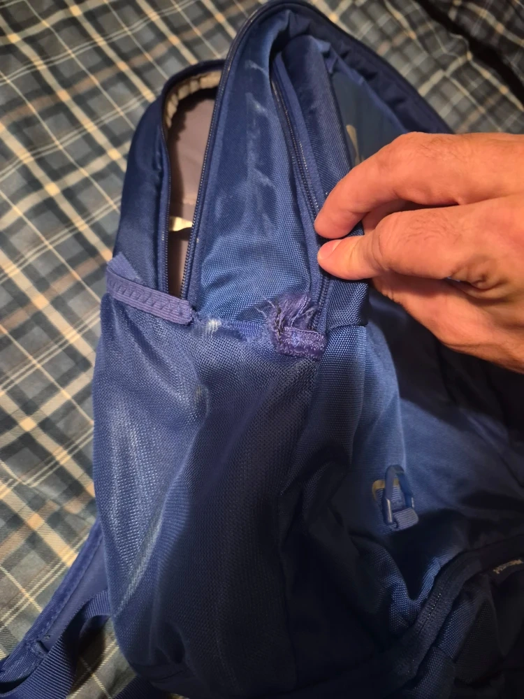 Good condition. All zippers work, clean, no tears or rips - with the exception of the water bottle holder on the left side (half of the thicker elastic material on top has come off, however can still hold bottle securely, plus there's a second bottle holder on the opposite side as well) (refer to picture)