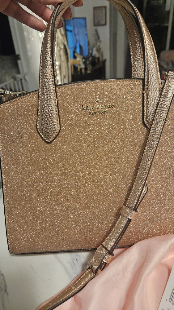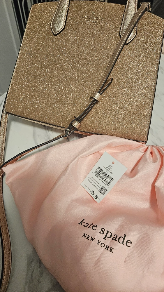 Selling a Kate Spade purse in a beautiful rose gold glitter finish! It's in great condition and comes with its original dust bag. The original price was $379.59. It's a stylish and eye-catching accessory, perfect for adding a touch of sparkle to any outfit