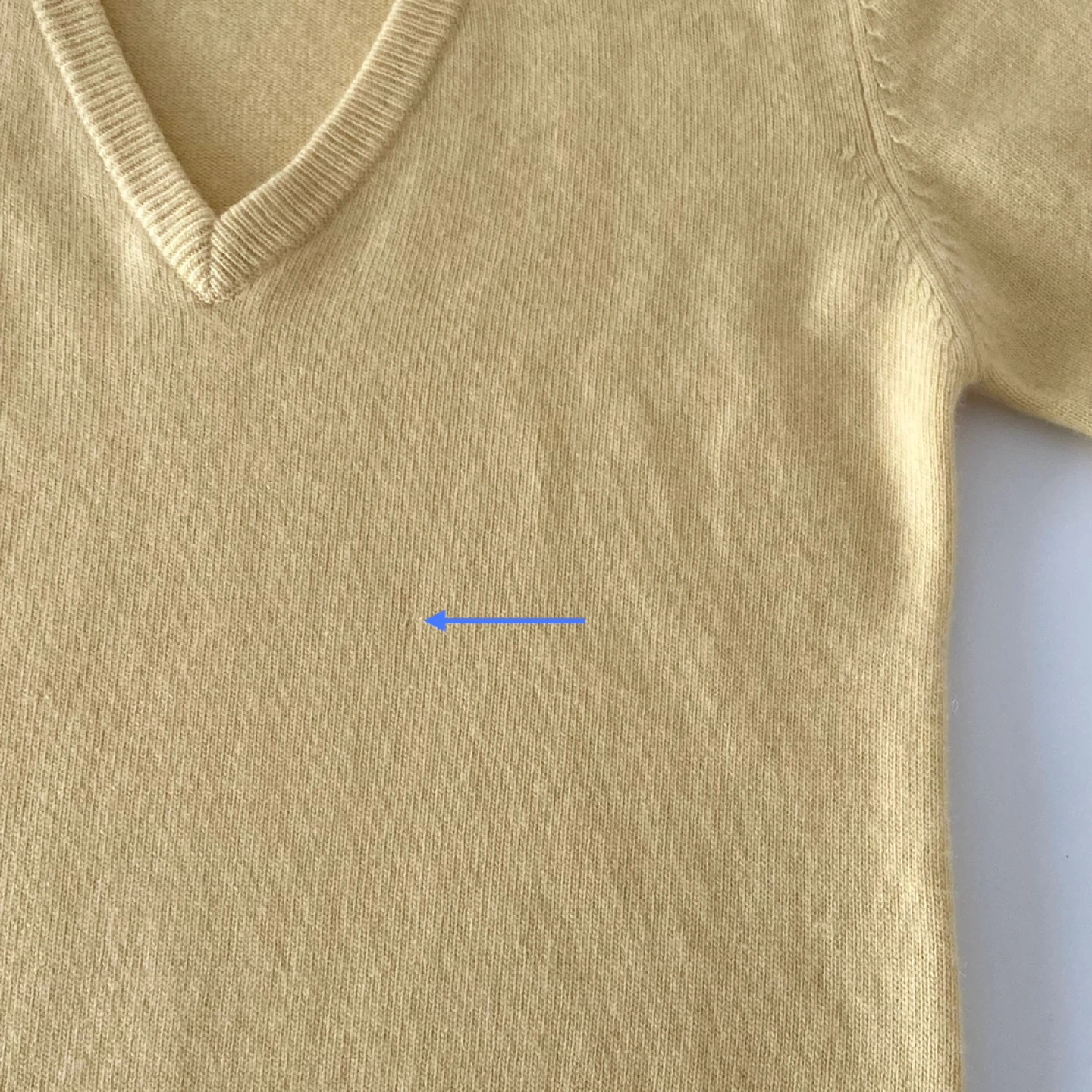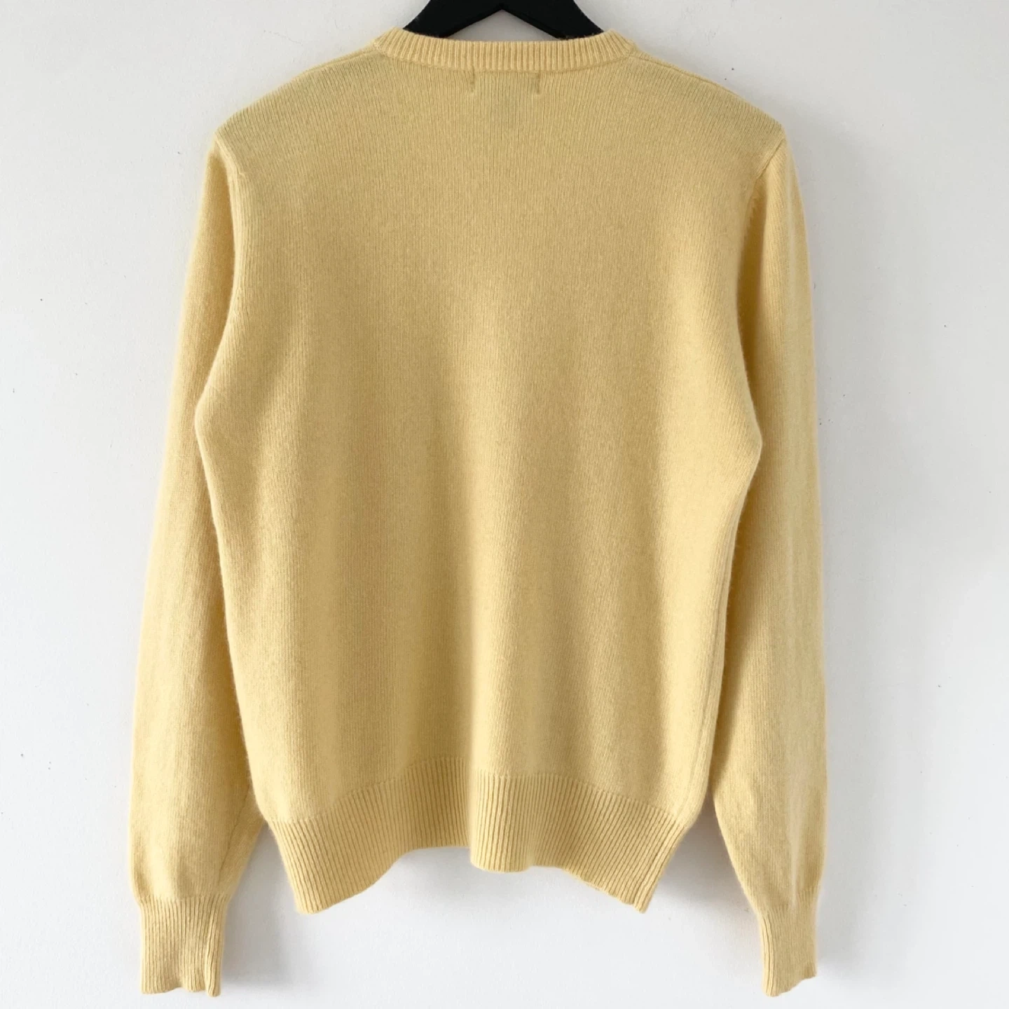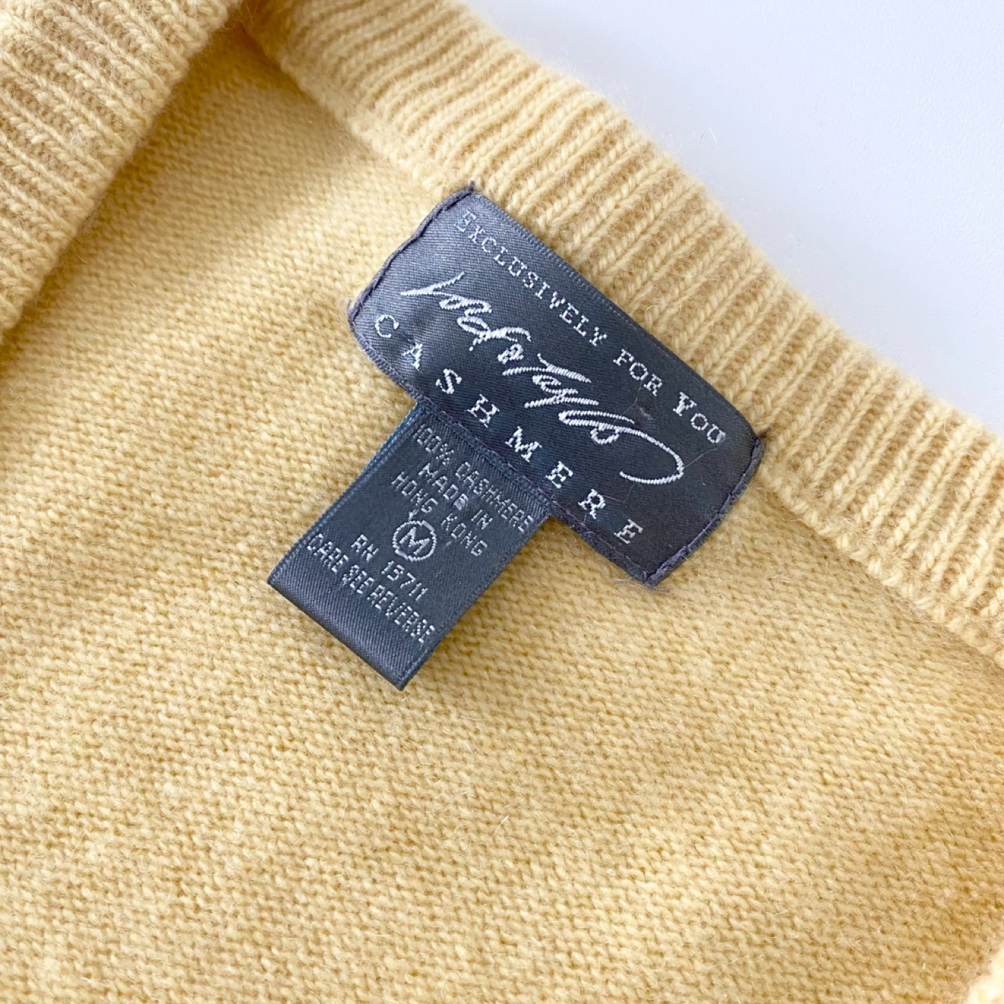 90's Vintage Lord and Taylor v-neck sweater. Made of Medium Weight 100% cashmere in a soft yellow colour. It's incredibly soft, a bit fluffy, luxurious and not itchy at all. There are minor holes which have been mended as per the pics with an arrow. They are not really visible. Otherwise no staining or pilling. It's clean and in excellent condition.